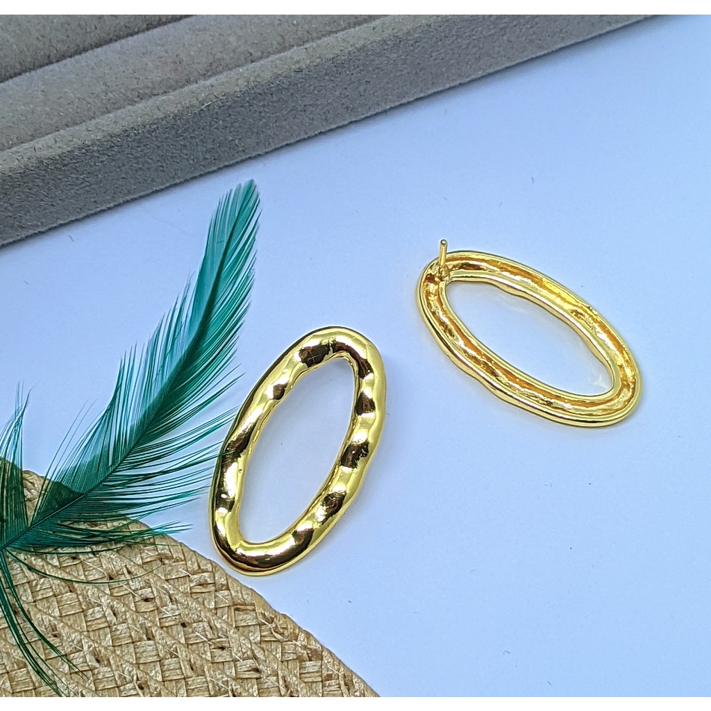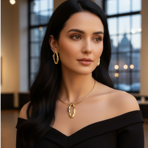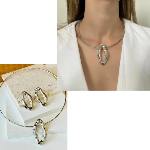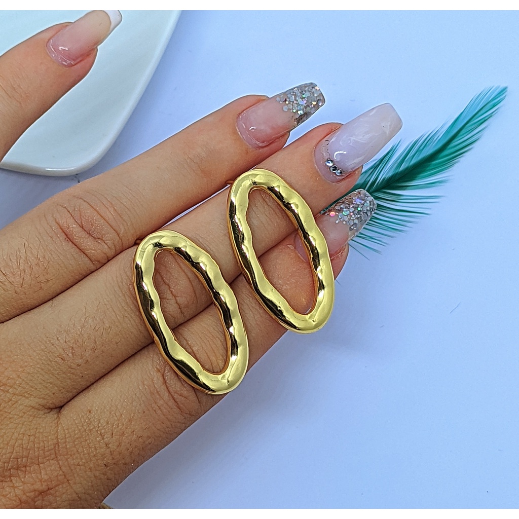 Kit Colar Choker e Brincos Aro Liso Rigido com Pingente Oval Orgâncio Vazado Folheado Ouro Moda Blogueira Tendência
