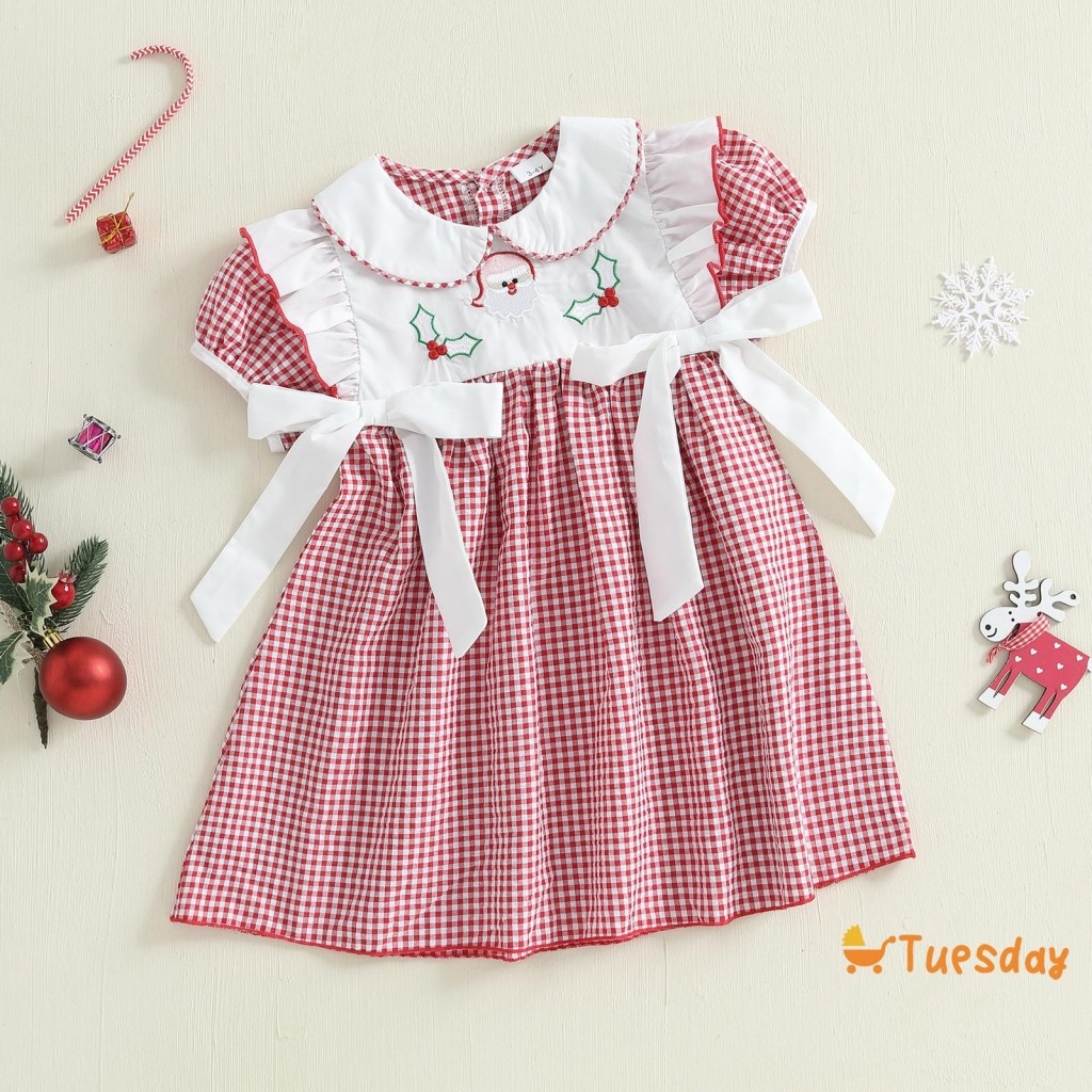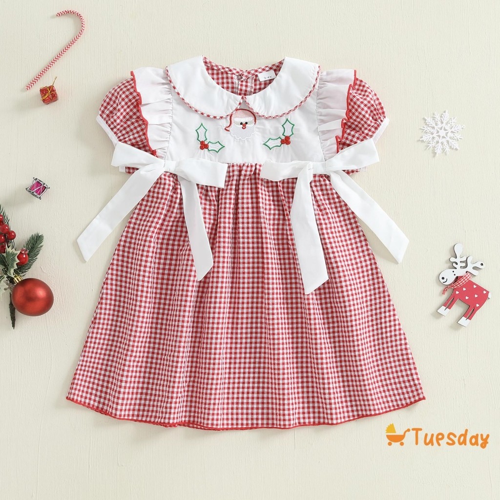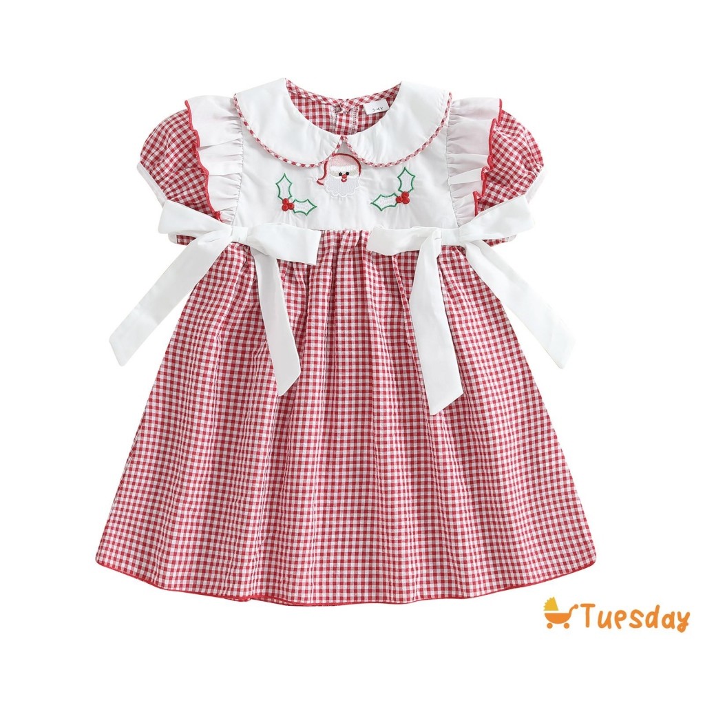 Vestido Infantil De Natal Com Estampa Xadrez De Papai Noel Bordado Manga Curta Bufante Gola Boneca Evasê