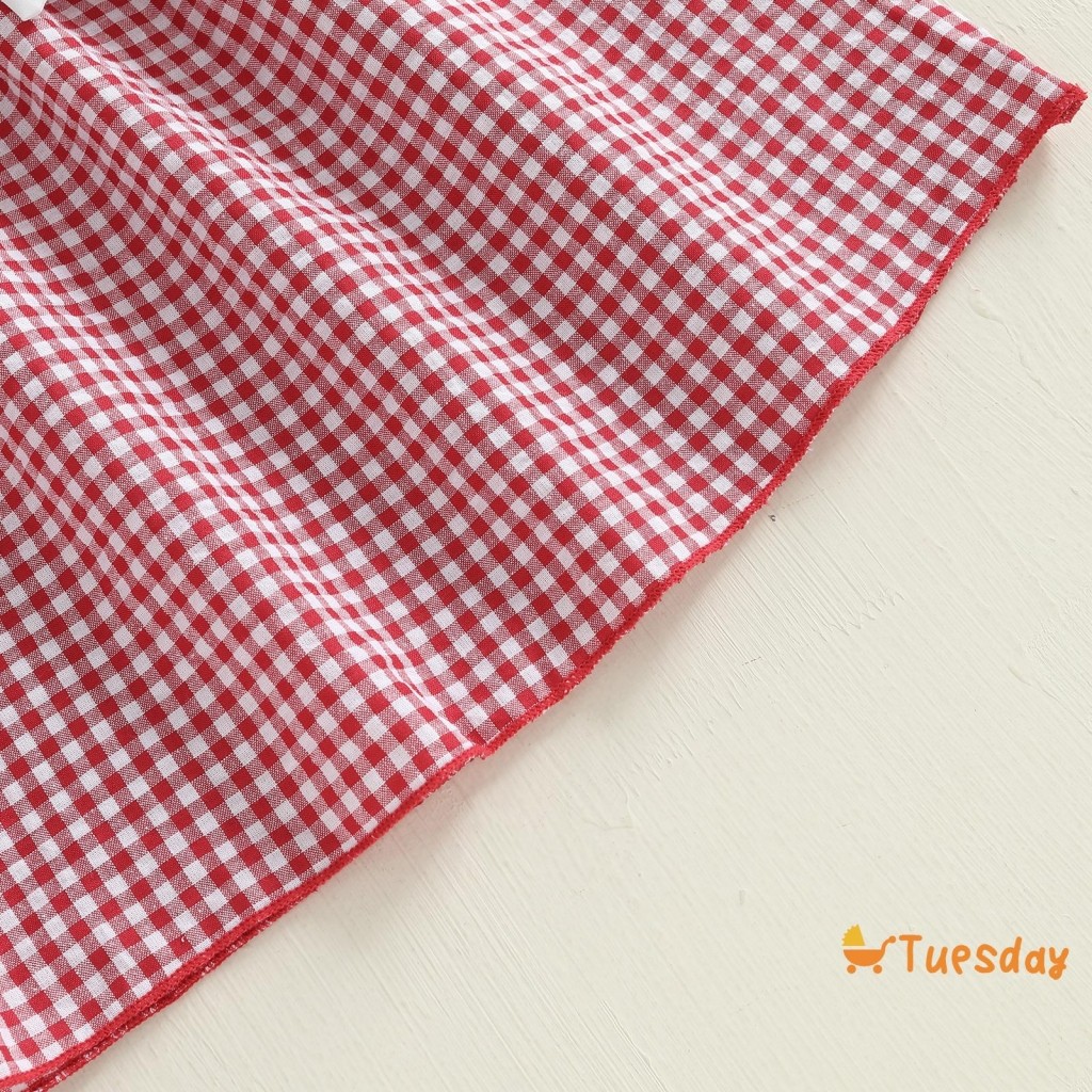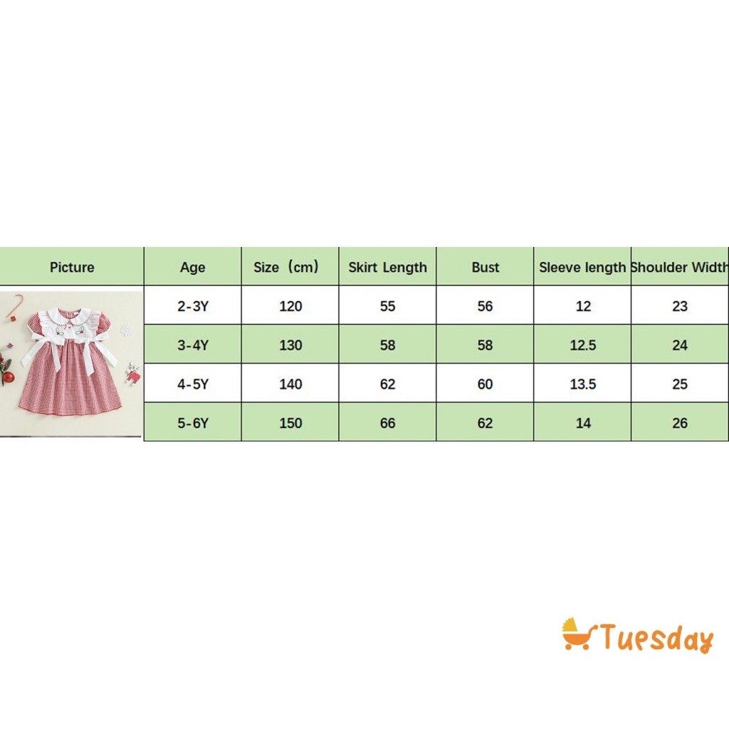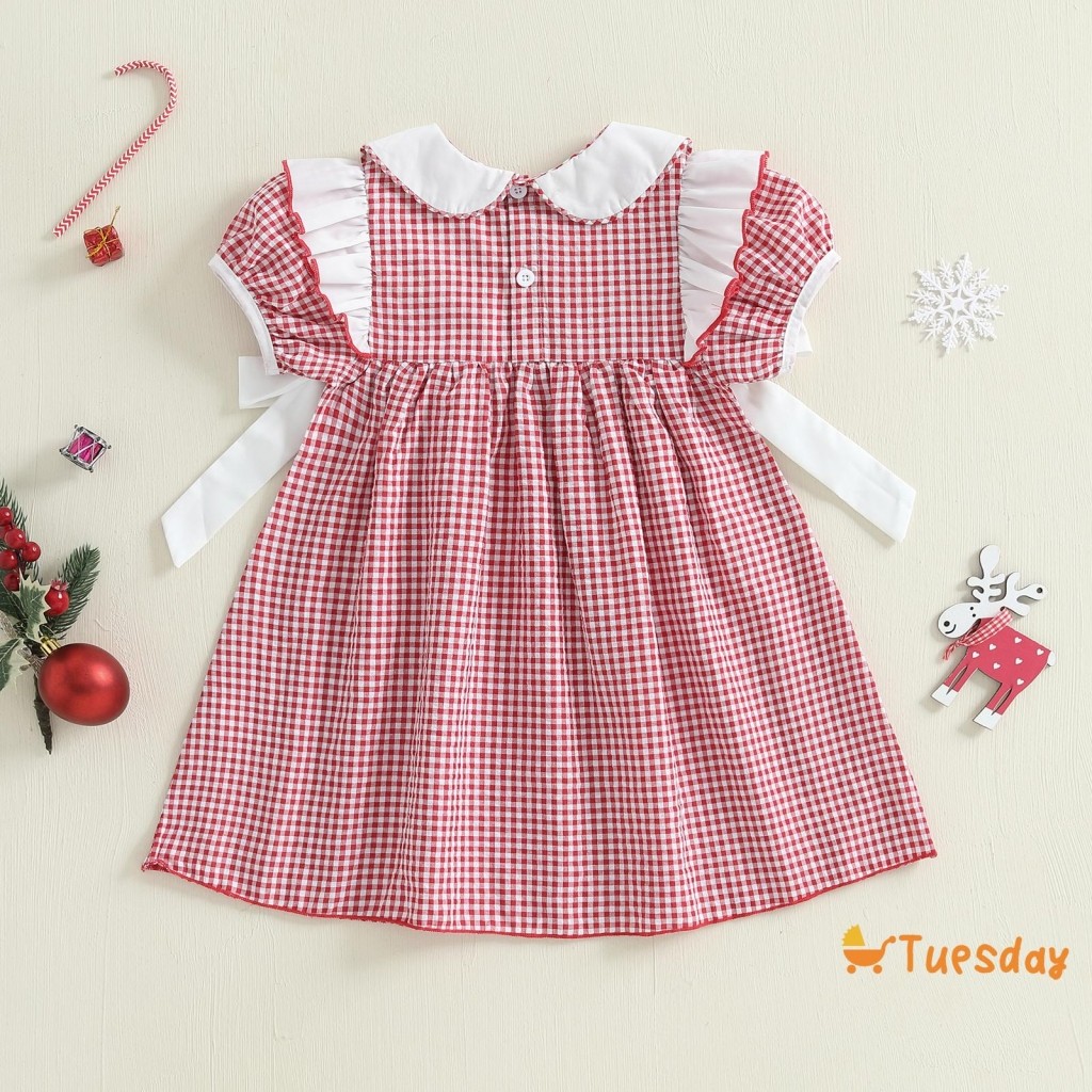 Vestido Infantil De Natal Com Estampa Xadrez De Papai Noel Bordado Manga Curta Bufante Gola Boneca Evasê