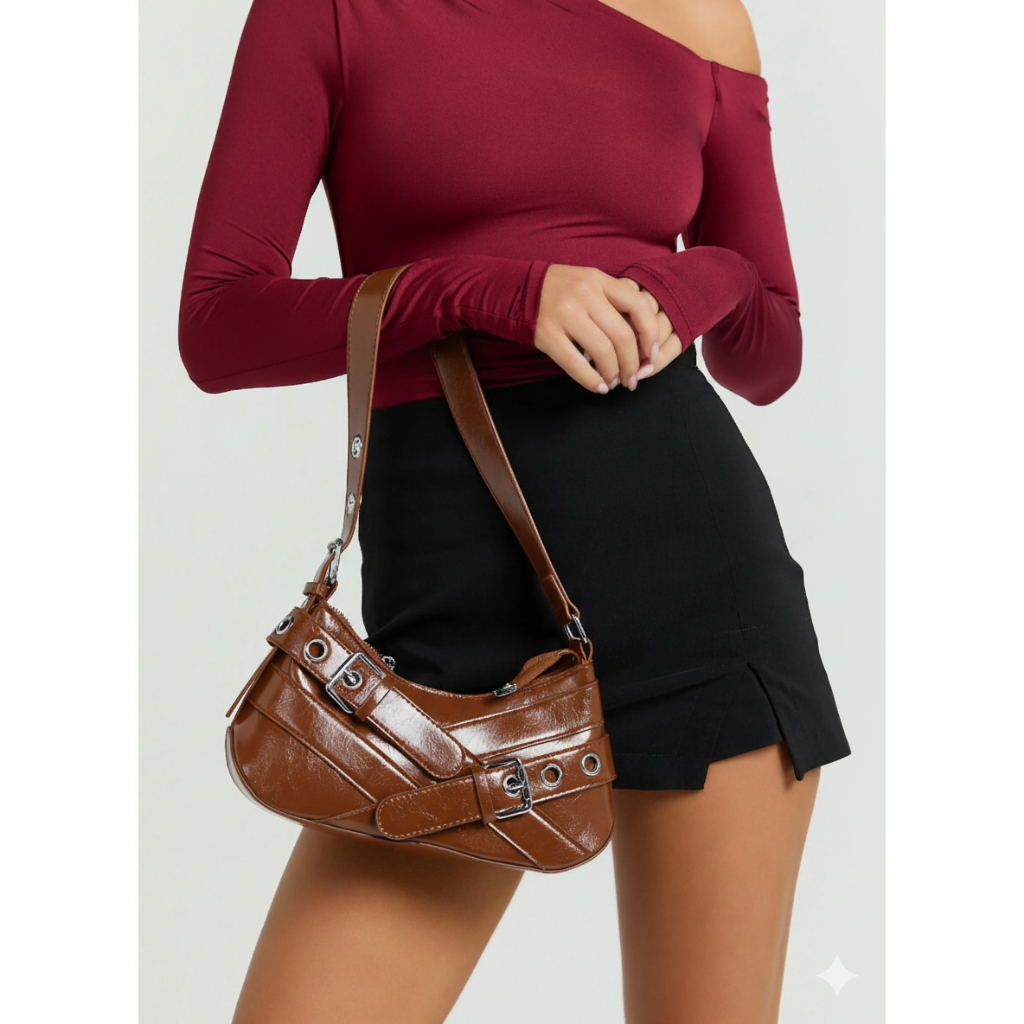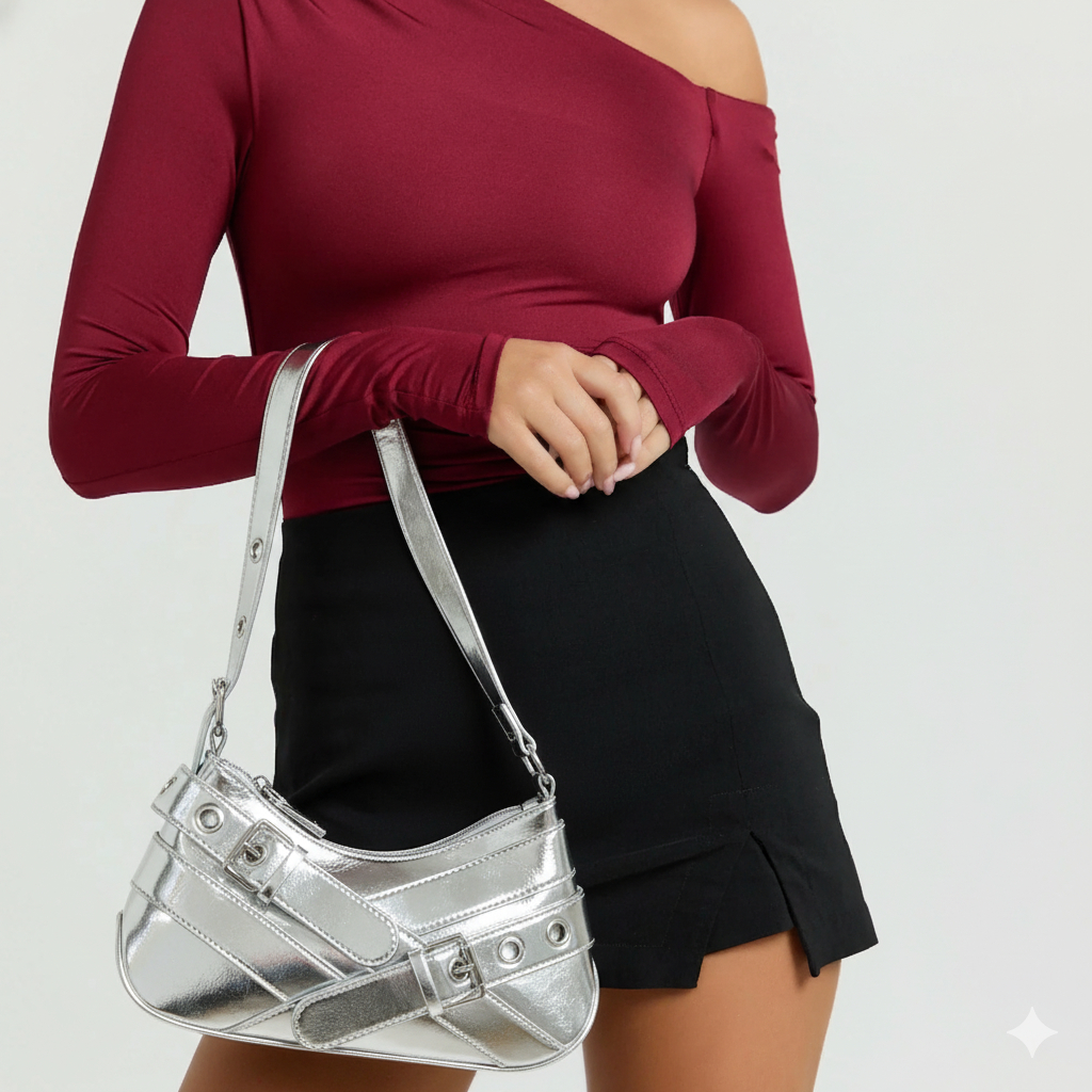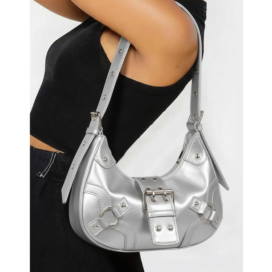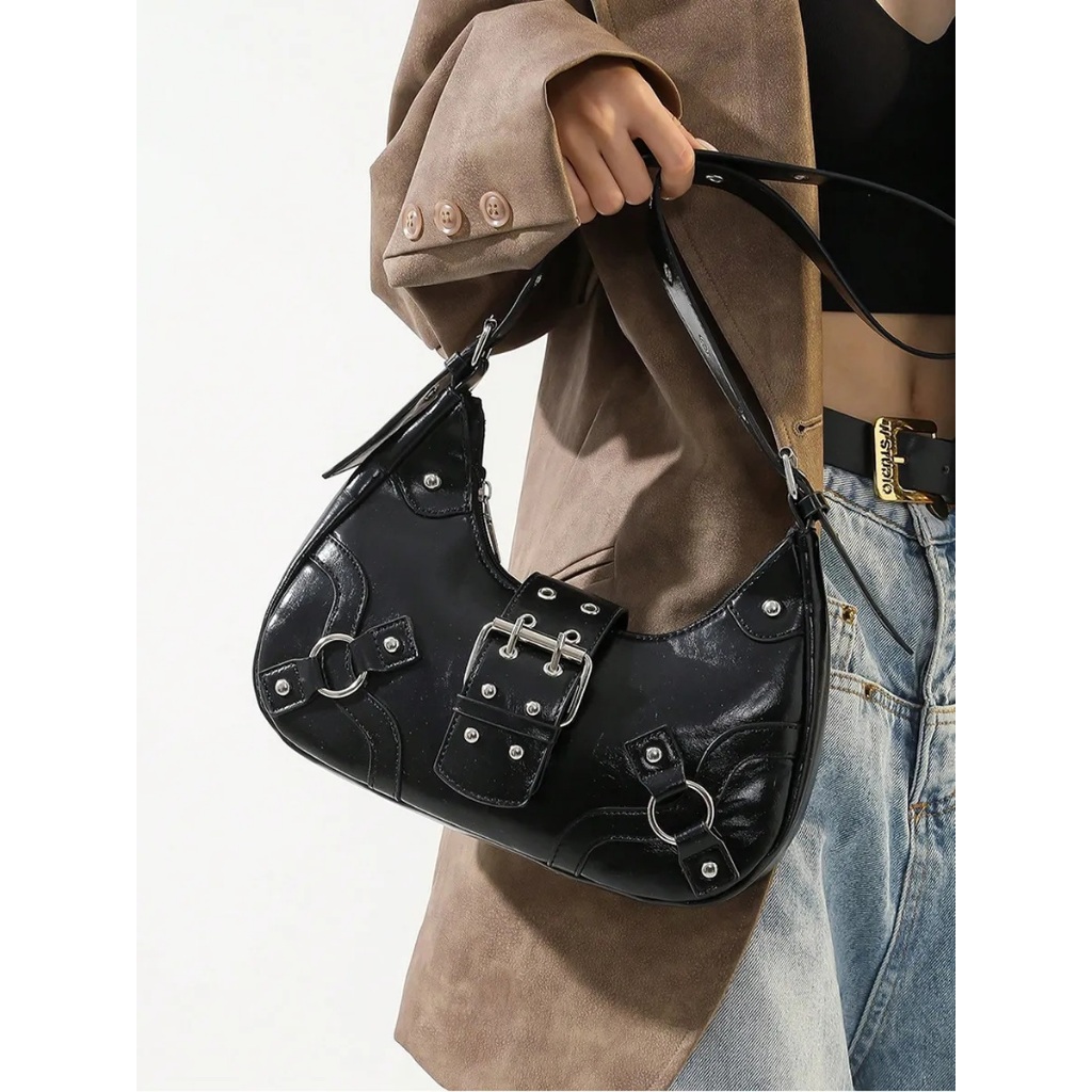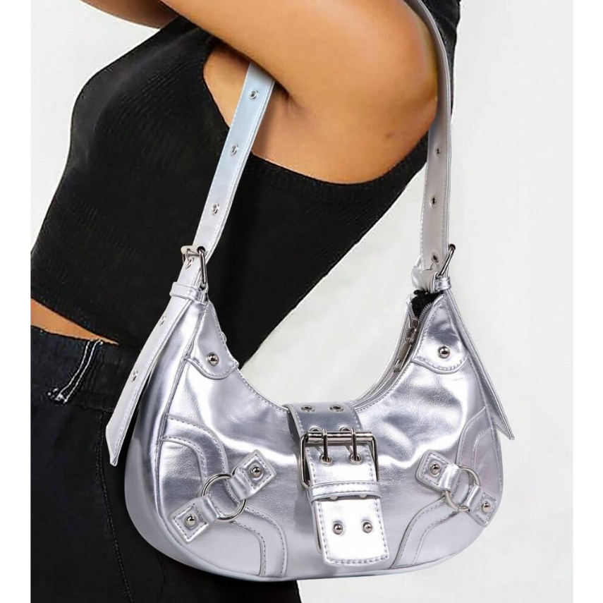Bolsa Feminina Media De Ombro Baguete Para Festa Festival Rock Y2K Bolsa Preta Prateada Com Fivela