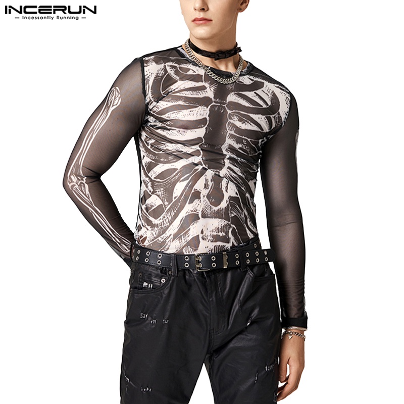 INCERUN Roupa Masculina Punk Clubwear Halloween Manga Longa Gola O Camisetas Transparentes