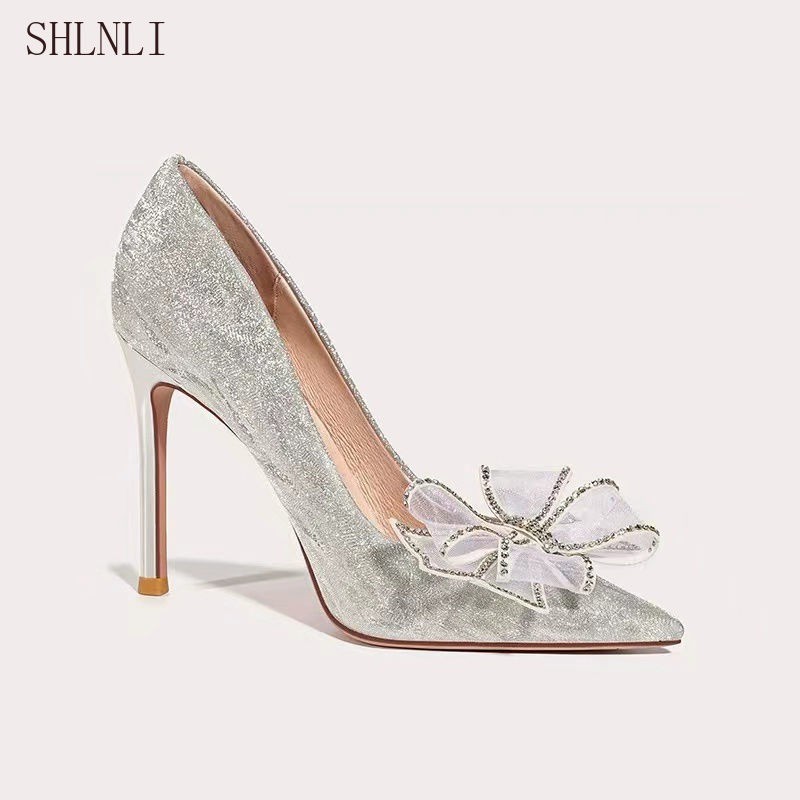 Primavera E Outono Feminino Prata Strass Arco Apontou Salto Alto Casual Elegante Sapatos De Casamento