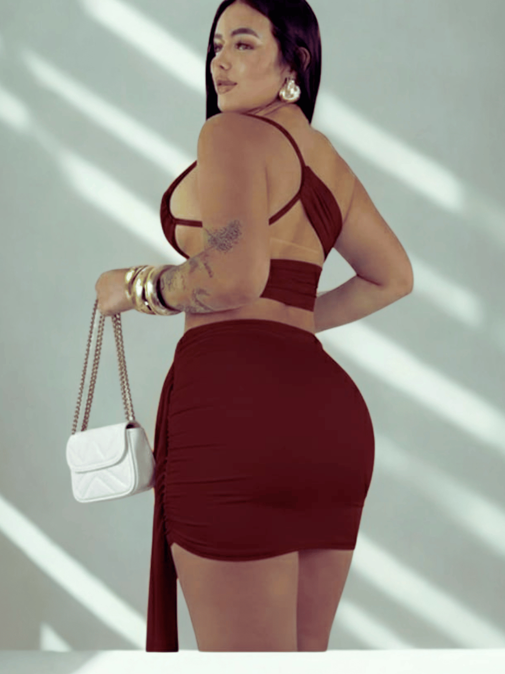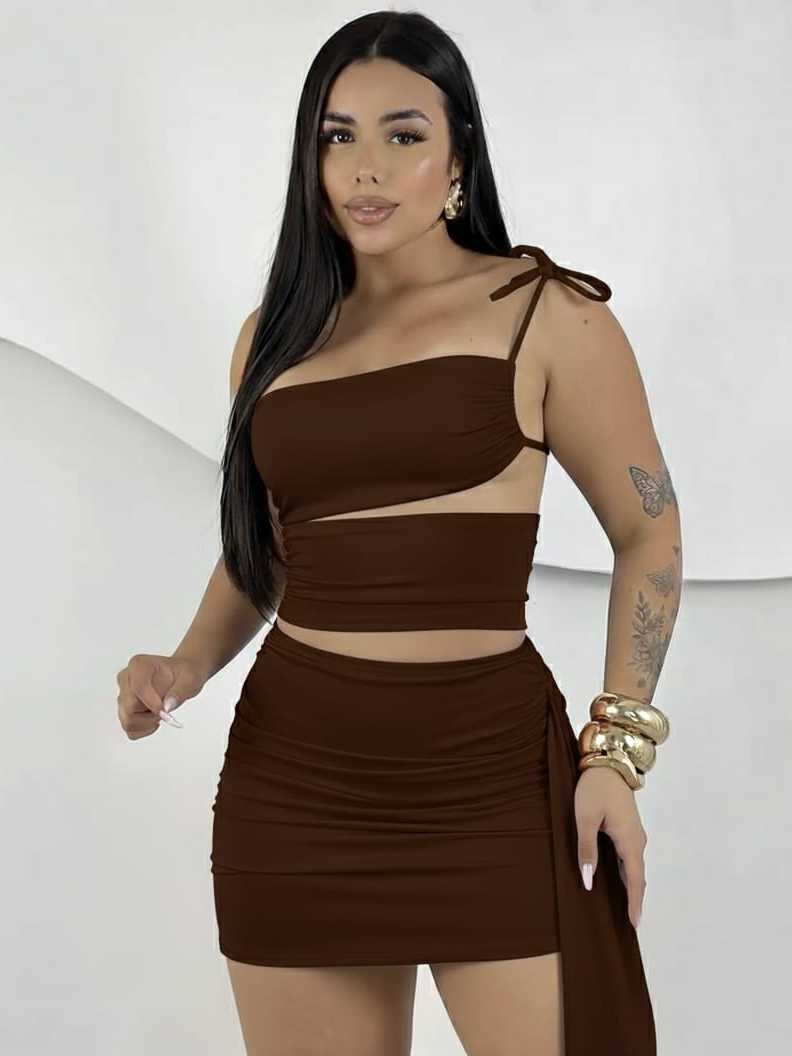 Conjunto Drika Mini Saia Com Um Charmoso Lenço do Lado e Cropped Super Decotado