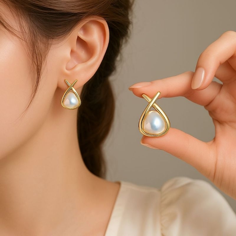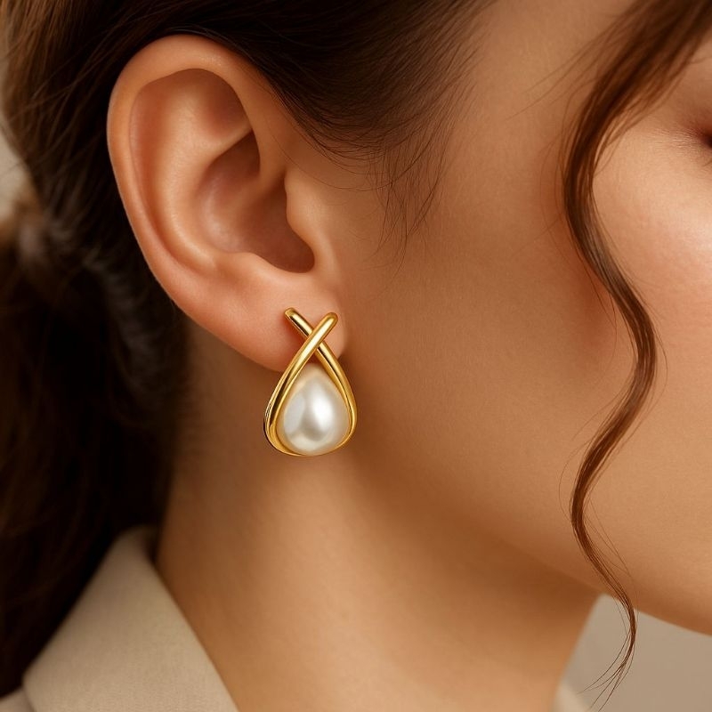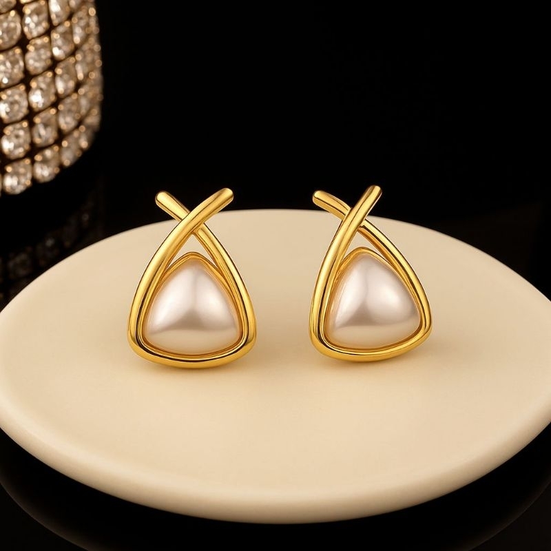 Brinco Formato Triangulo com Pérola Folheado a Ouro 18k Joias da Moda Brincos Banhado Luxo
