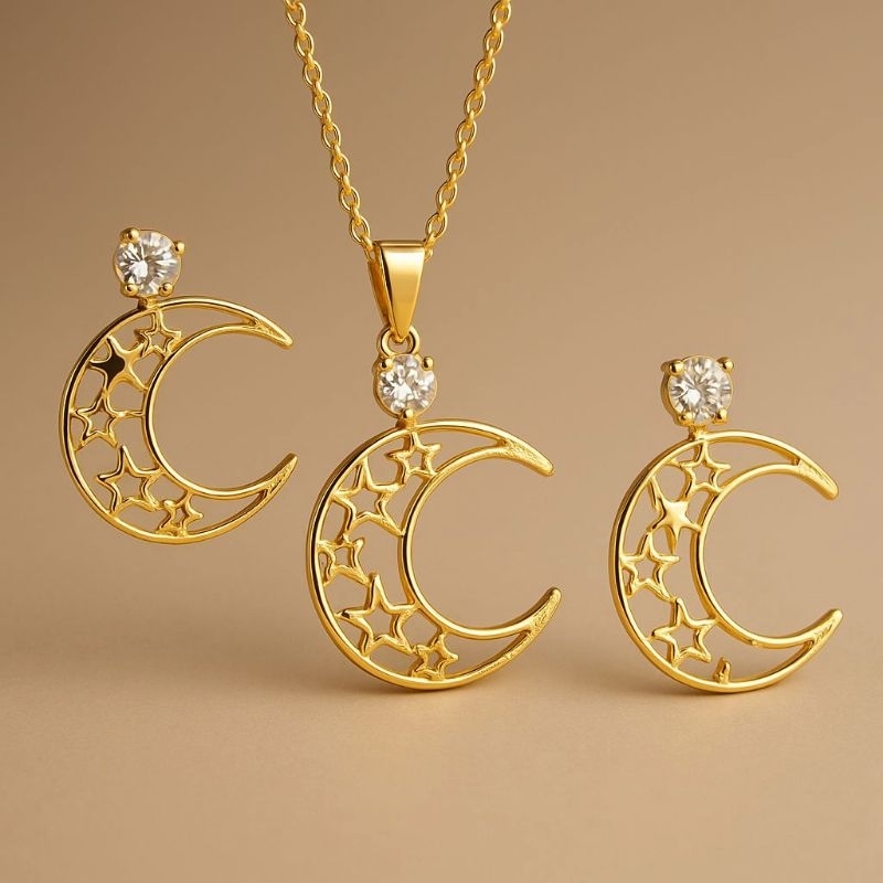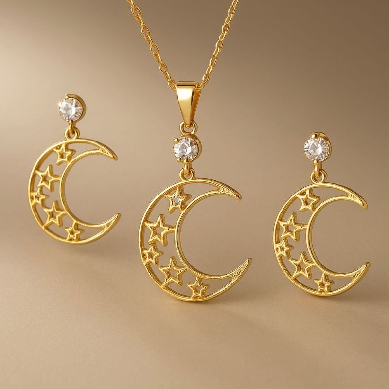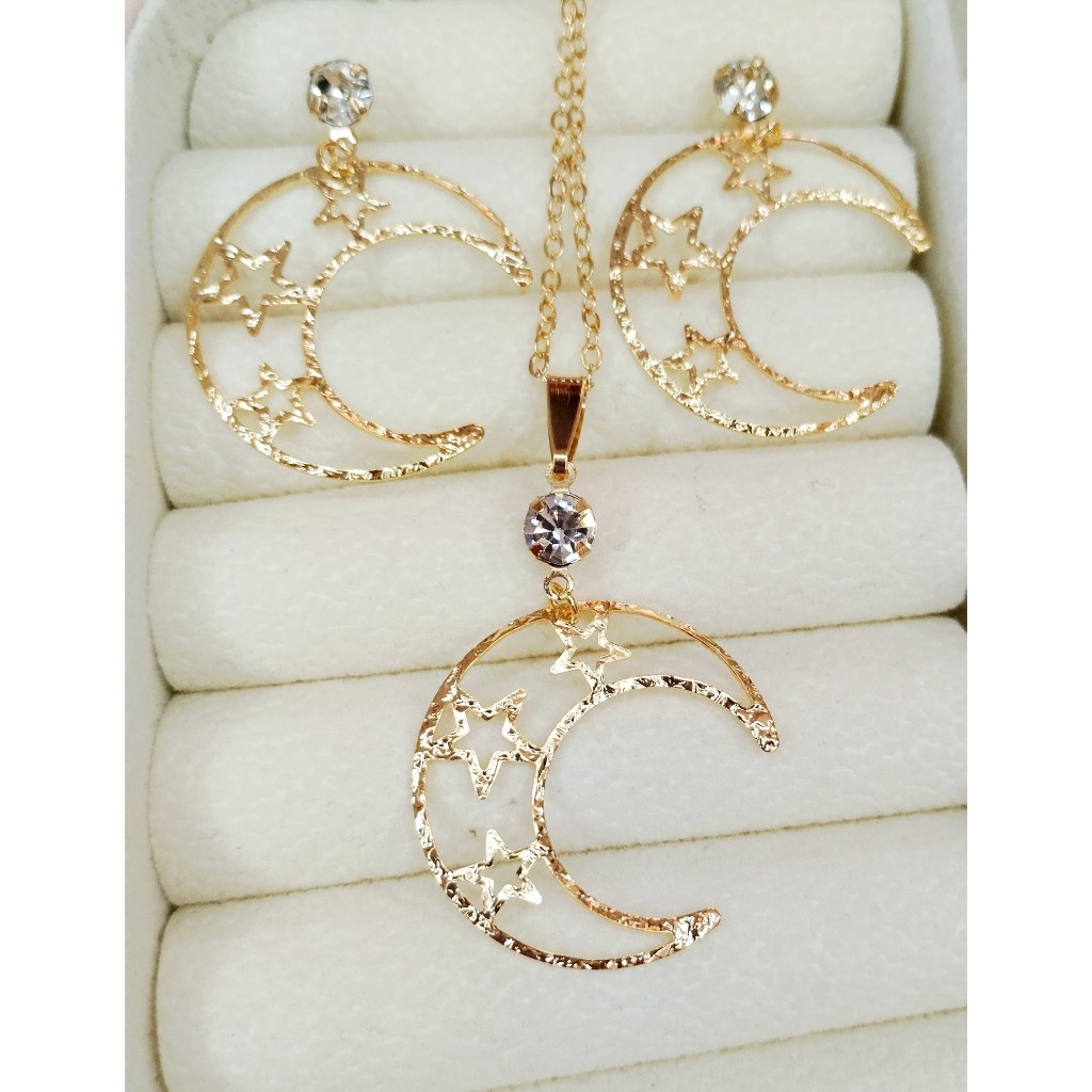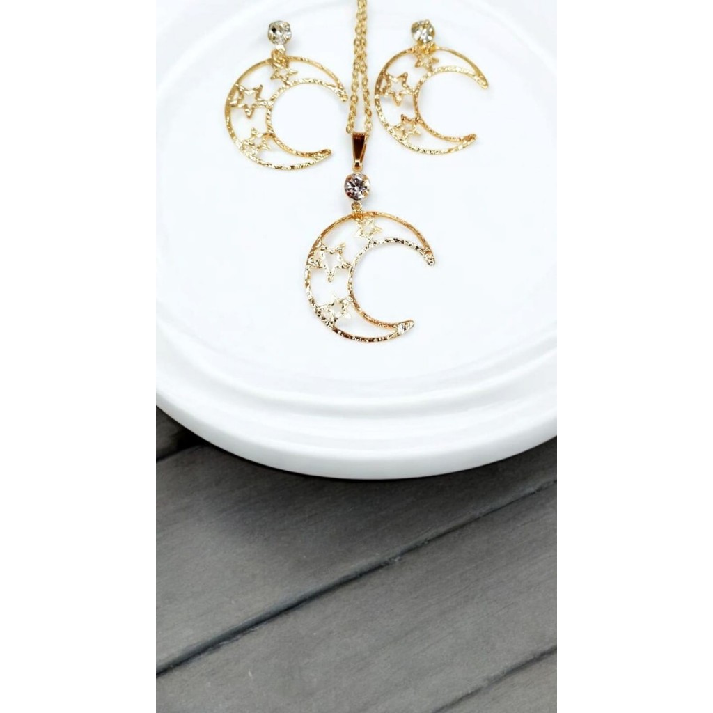 Kit Colar + Brinco Lua e Estrela Vazado Folheado