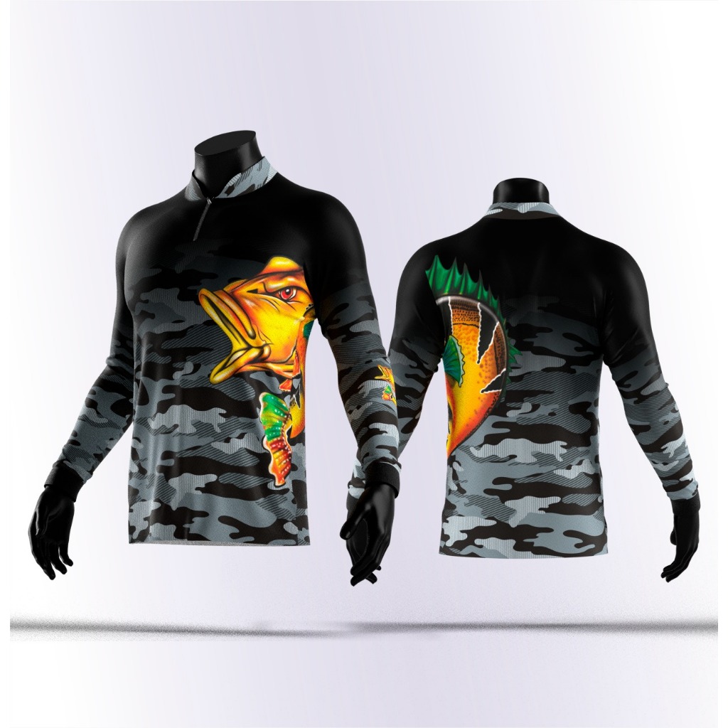 Camisa de Pesca Proteção Solar Uv50 Blusa Tecido Dry fit Camiseta Peixe DE Pescaria Com Zíper Tucunare, Dourado