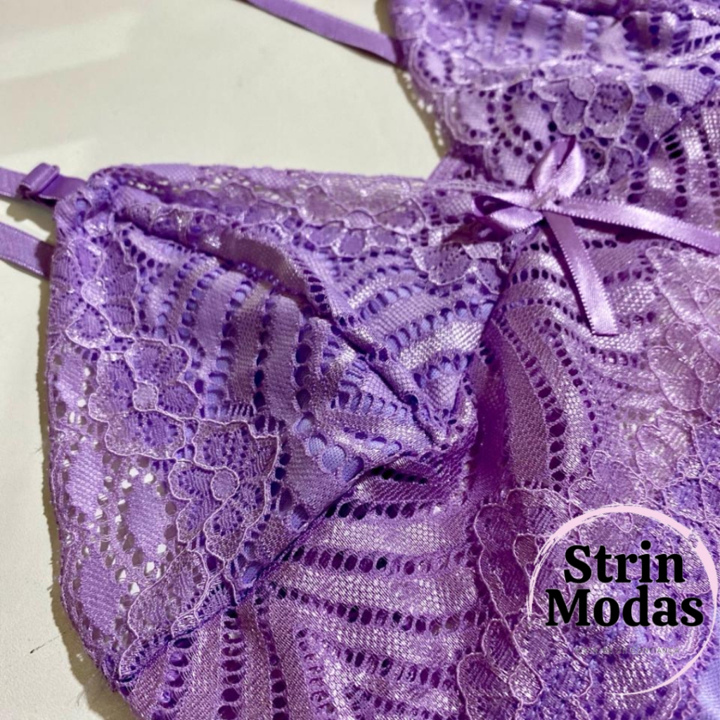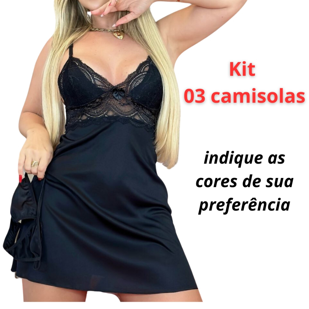 KIT 03 Camisolas Feminina Renda Luxo Strin acompanhadas de 03 Calcinha Fio Dental - Cores Sortidas