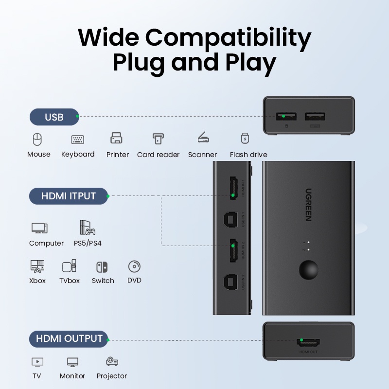 UGREEN 4K60Hz HDMI KVM Interruptor 2 Em 1 OUT Ultra HD Caixa De Comutação Para Monitor