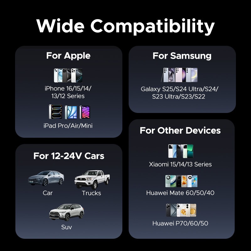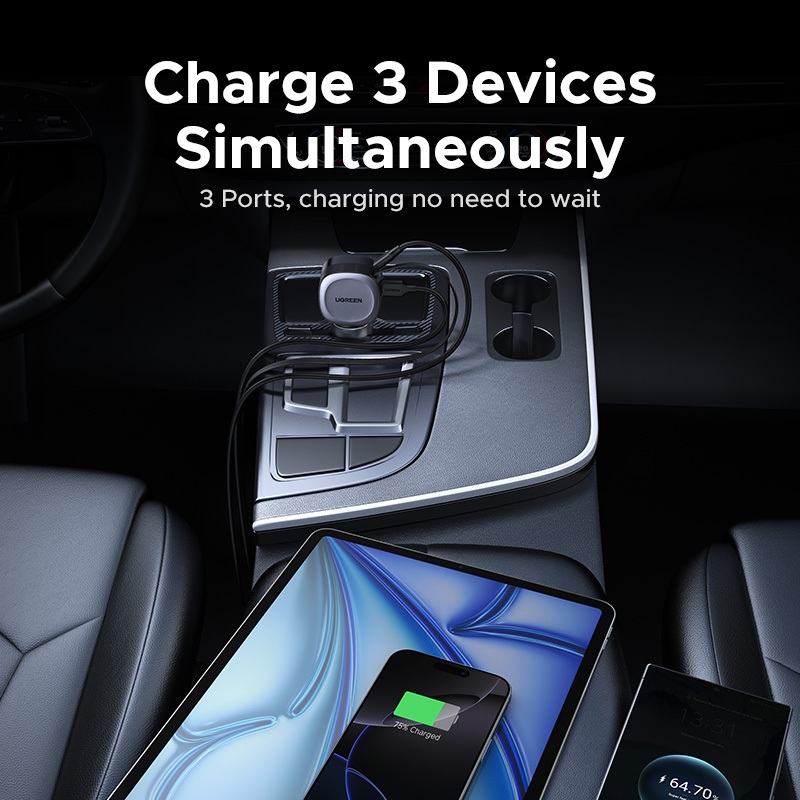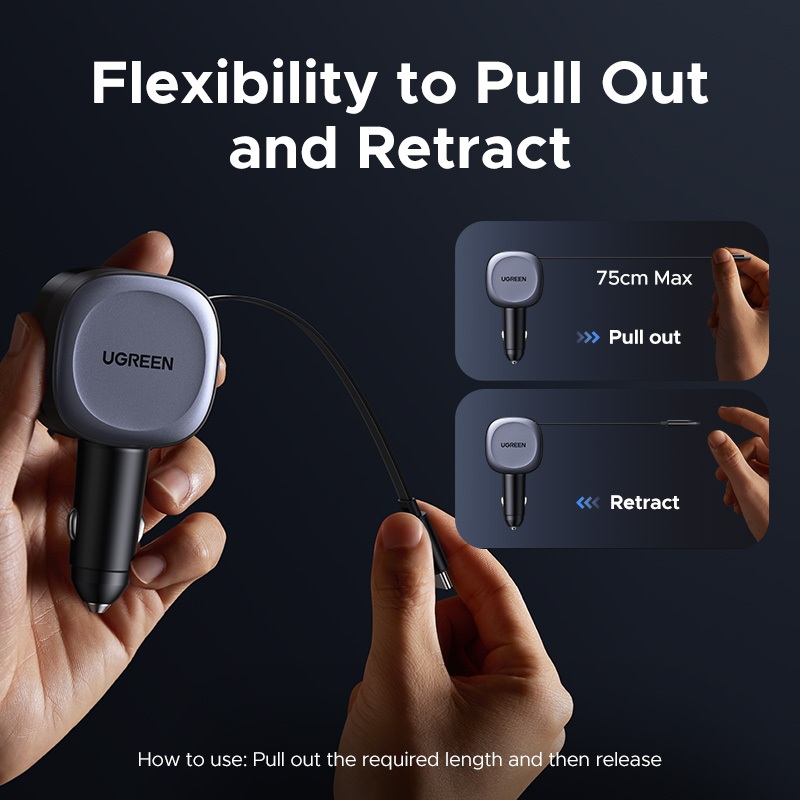 Carregador De Carro UGREEN 75W Retrátil Flexível 3 Portas USB A PD 30W Carregamento Rápido Com Cabo C 75 Cm Máx . Para i