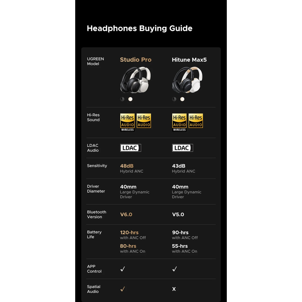 Fones De Ouvido Sem Fio UGREEN Studio Pro 48dB ANC Sobre Bluetooth | Cancelamento Ativo De Ruído Alta Resolução LDAC 120