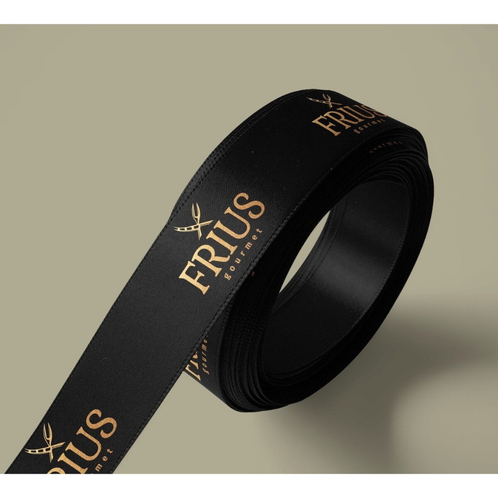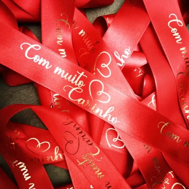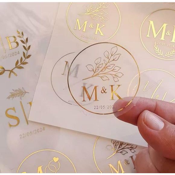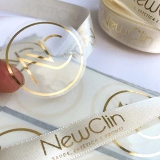 Kit 50 Adesivos Transparente e 10m de Fita de Cetim personalizado em Hotstamping Dourado ou Prata.