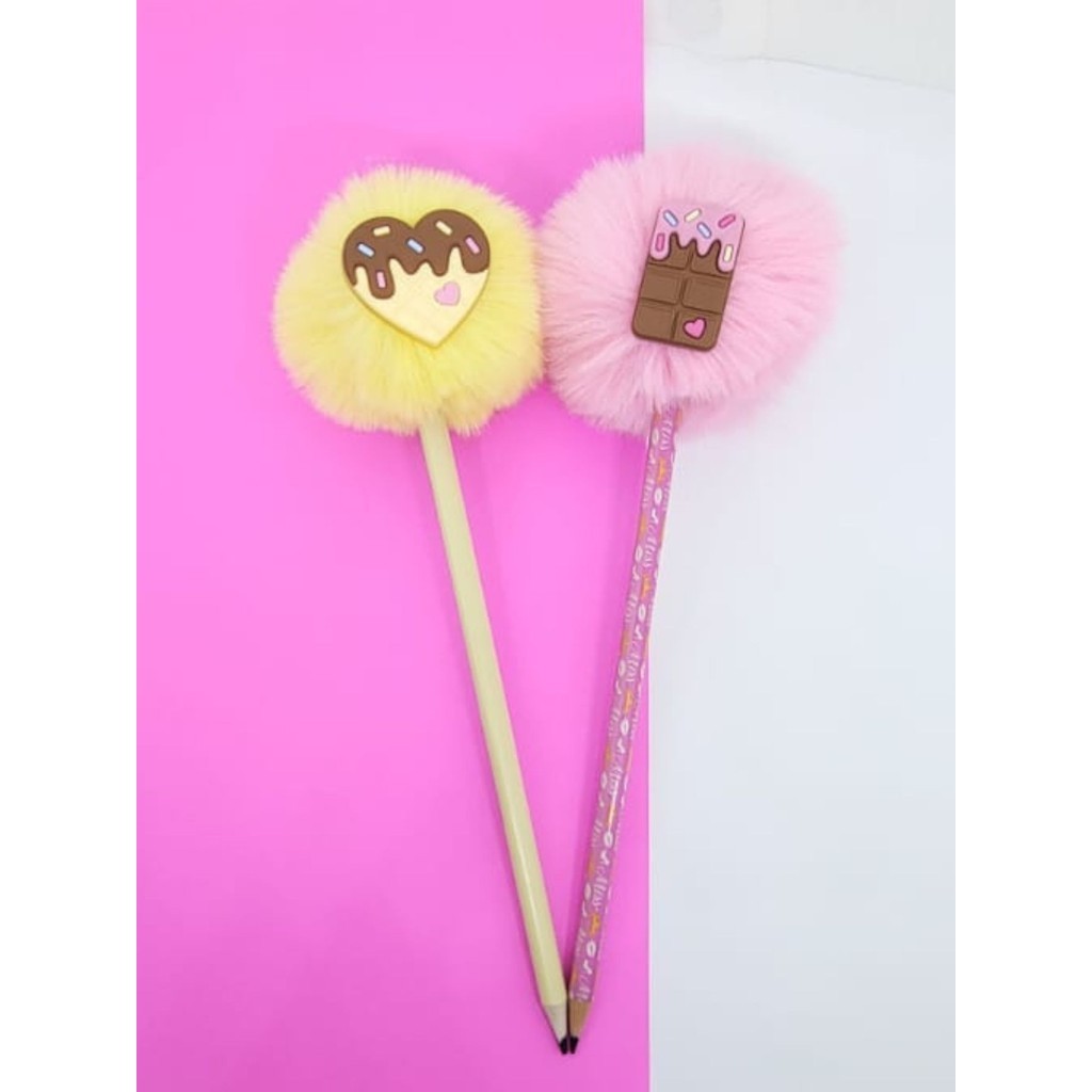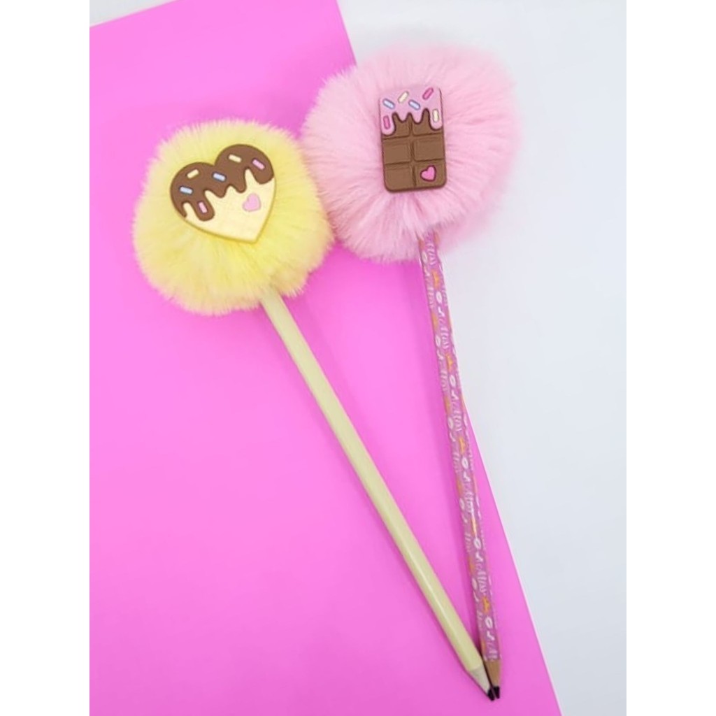 02 Lapis Pompom lápis de escrever duas peças aplique chocolate papelaria material escolar menina presente