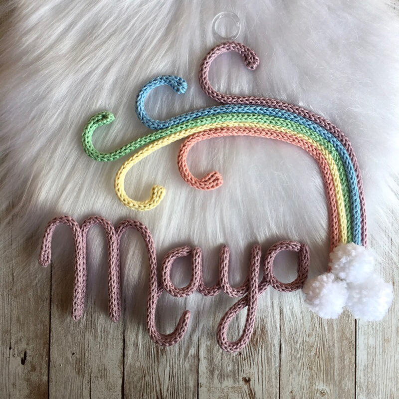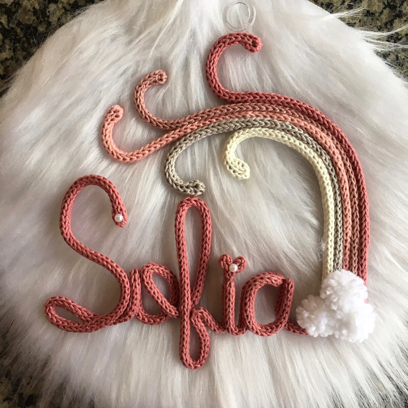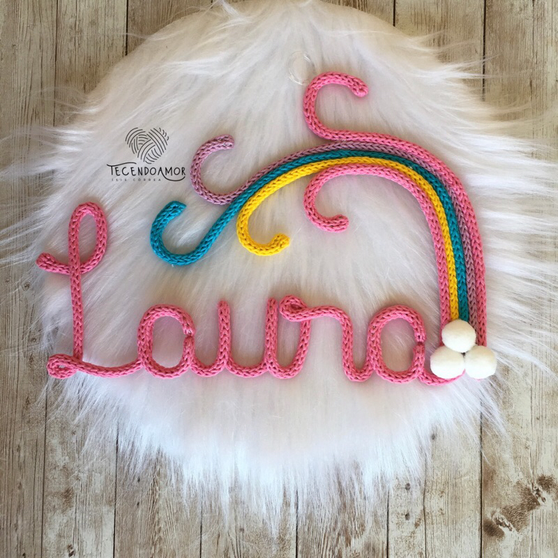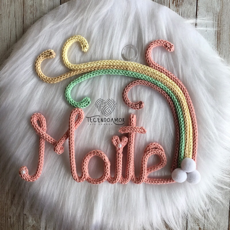 Enfeite de Porta Guirlanda Maternidade para Menina Bebê Arco Íris Decoração de Quarto de Bebê Nome em Tricotin