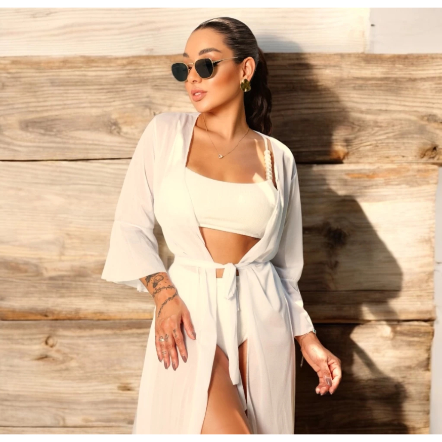 Saida de Praia Longa Kimono de Praia Cardigan Verão Piscina Feminino Canga Fit Mulher Banho de Sol Estilo
