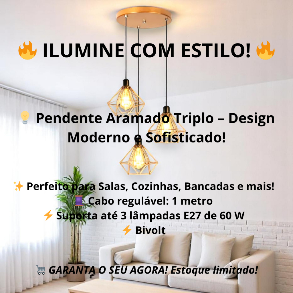 Luminária Teto Conjunto Lustre Pendente Diamante Triplo e-led Aramado Cozinha Sala Quarto Lavabo