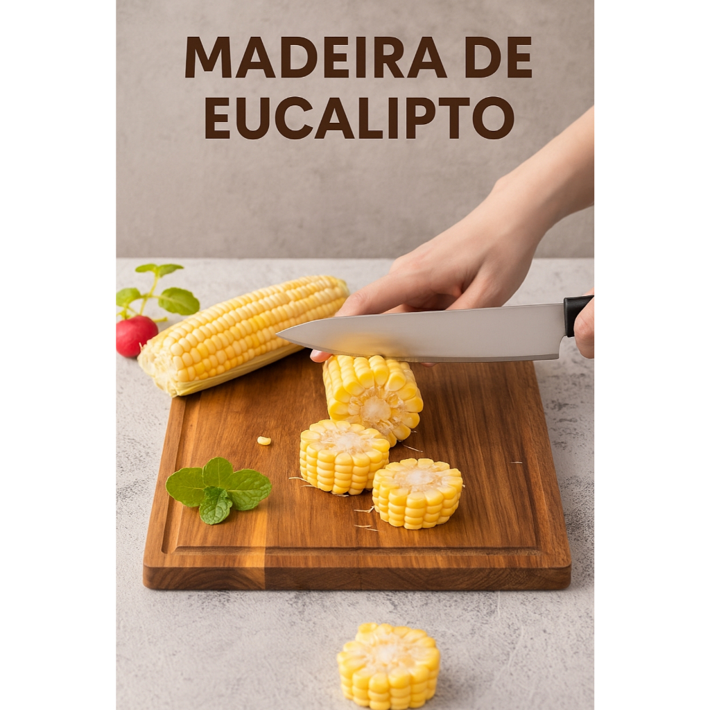 Kit Tábua de Carne Madeira Eucalipto + Faca e Garfo Inox – Resistência e Beleza no Seu Churrasco