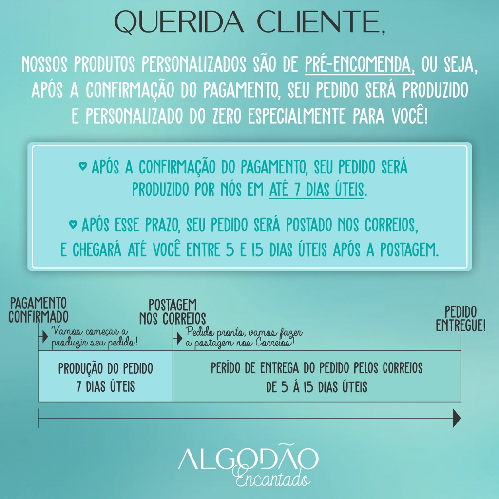 Sob encomenda: envio após 7 dias da compra
