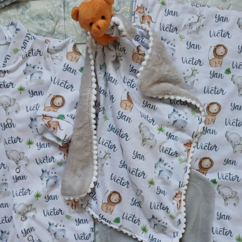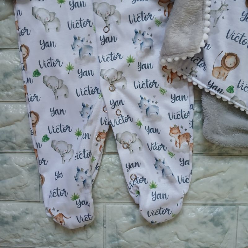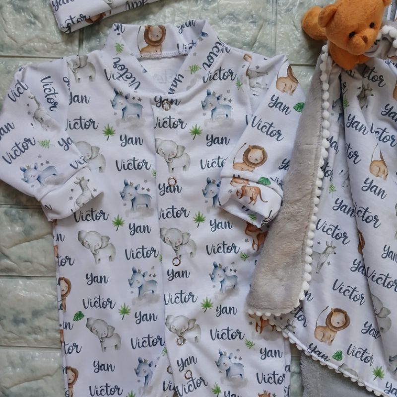 Saída Maternidade personalizada com 4 peças - Macacão, touca, manta e naninha - Kit Bebê Menino com nome