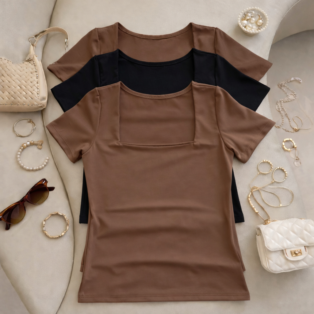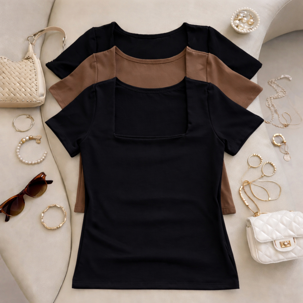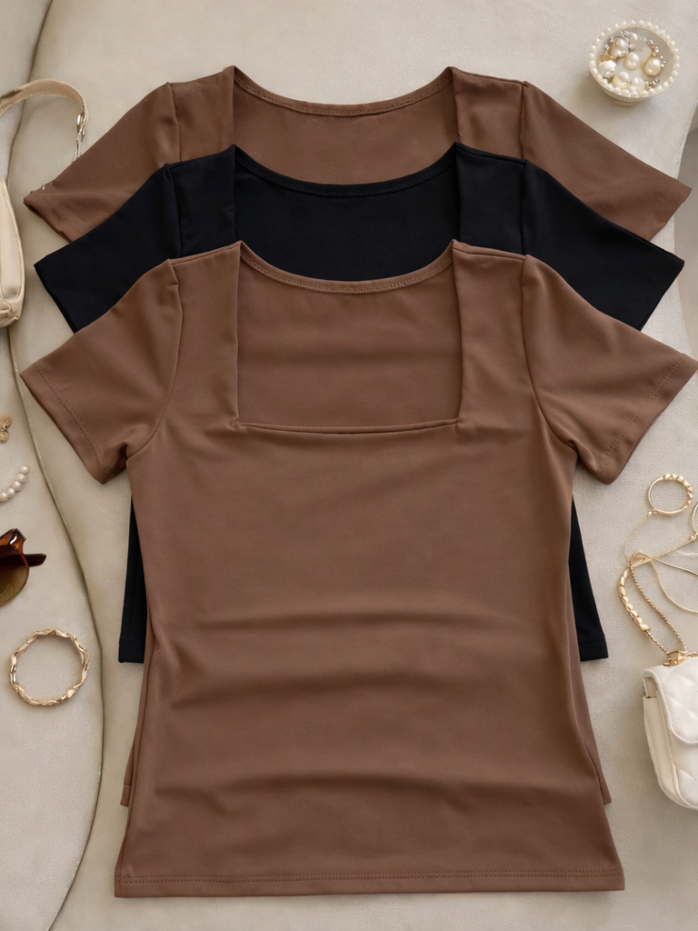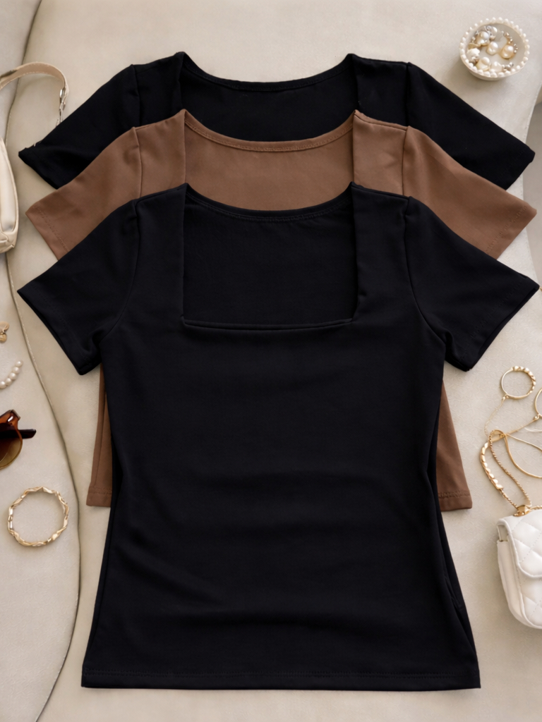 kit 3 Blusas Feminina Baby Look Manga Curta Gola Quadrada Suplex Decote Casual Versátil Blogueira