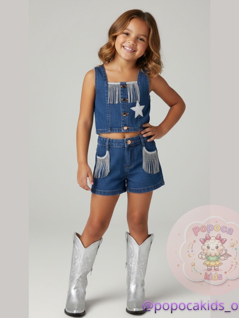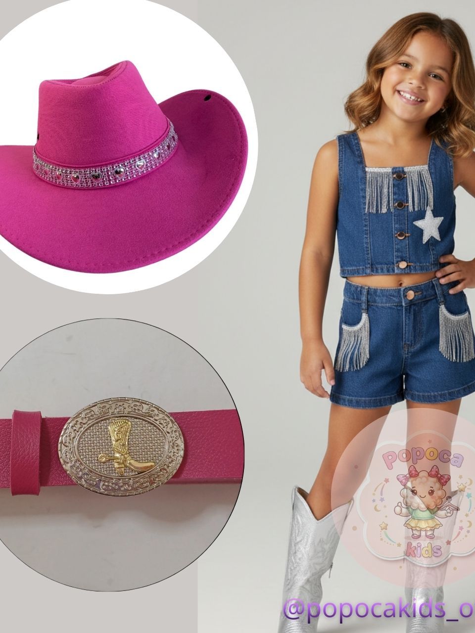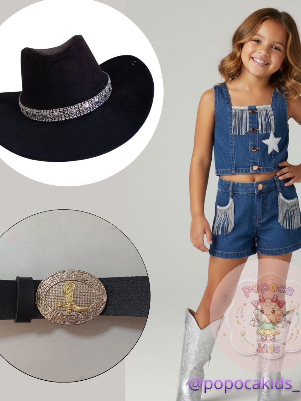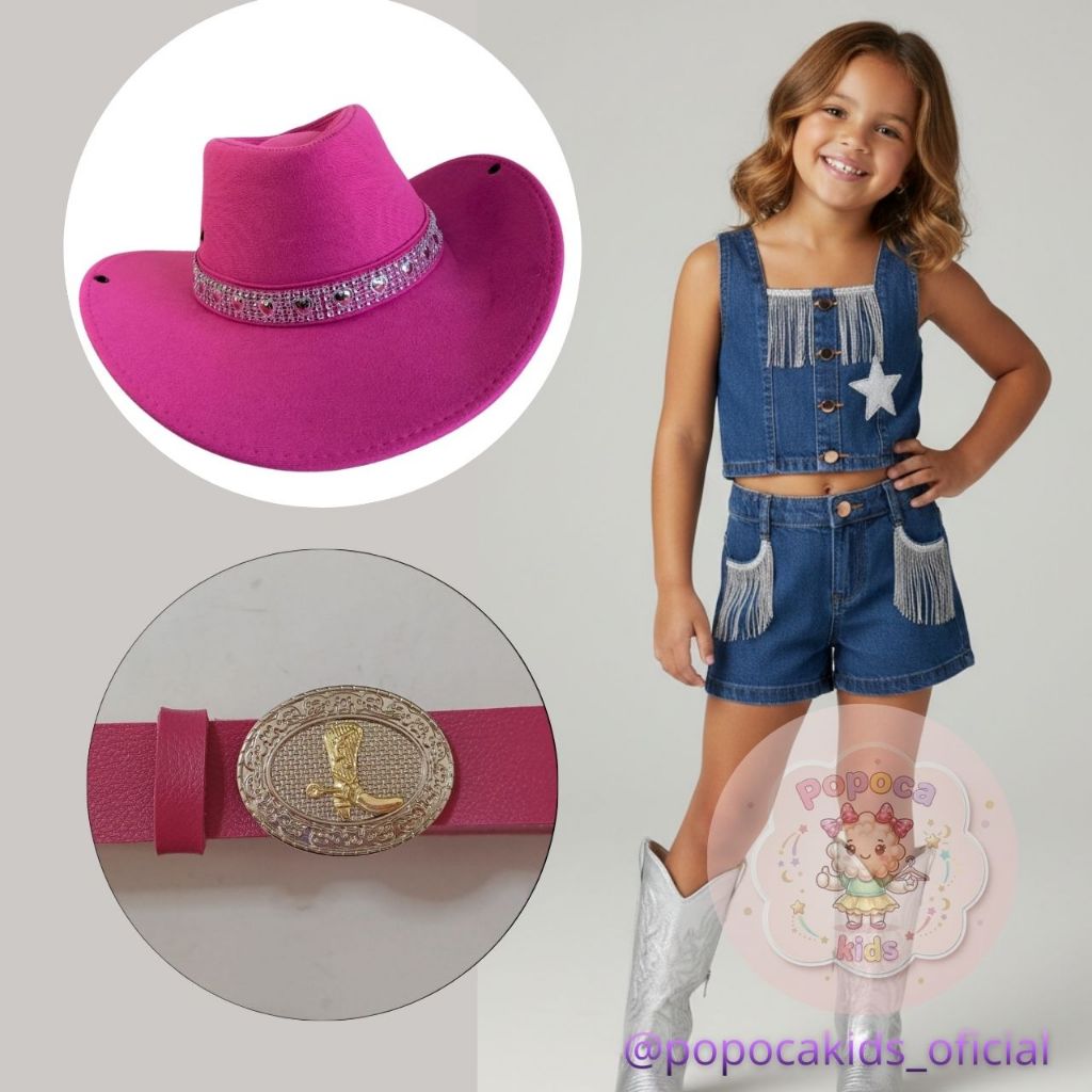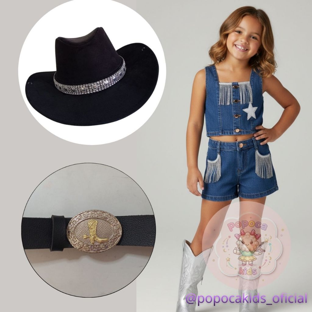 Kit Infantil Country Completo Cropped e Short com Franjas, Chapéu e Cinto ajustável Ana Castela