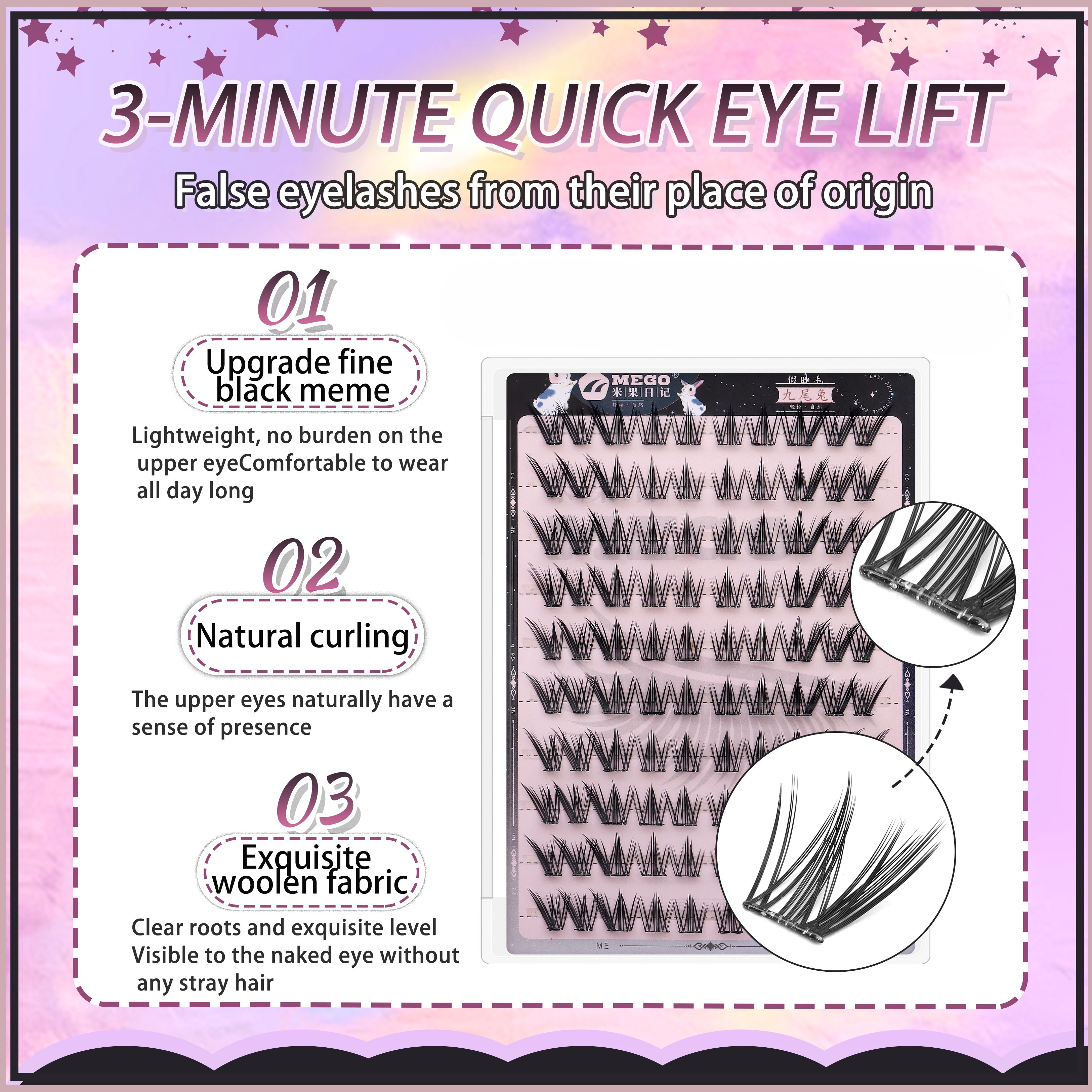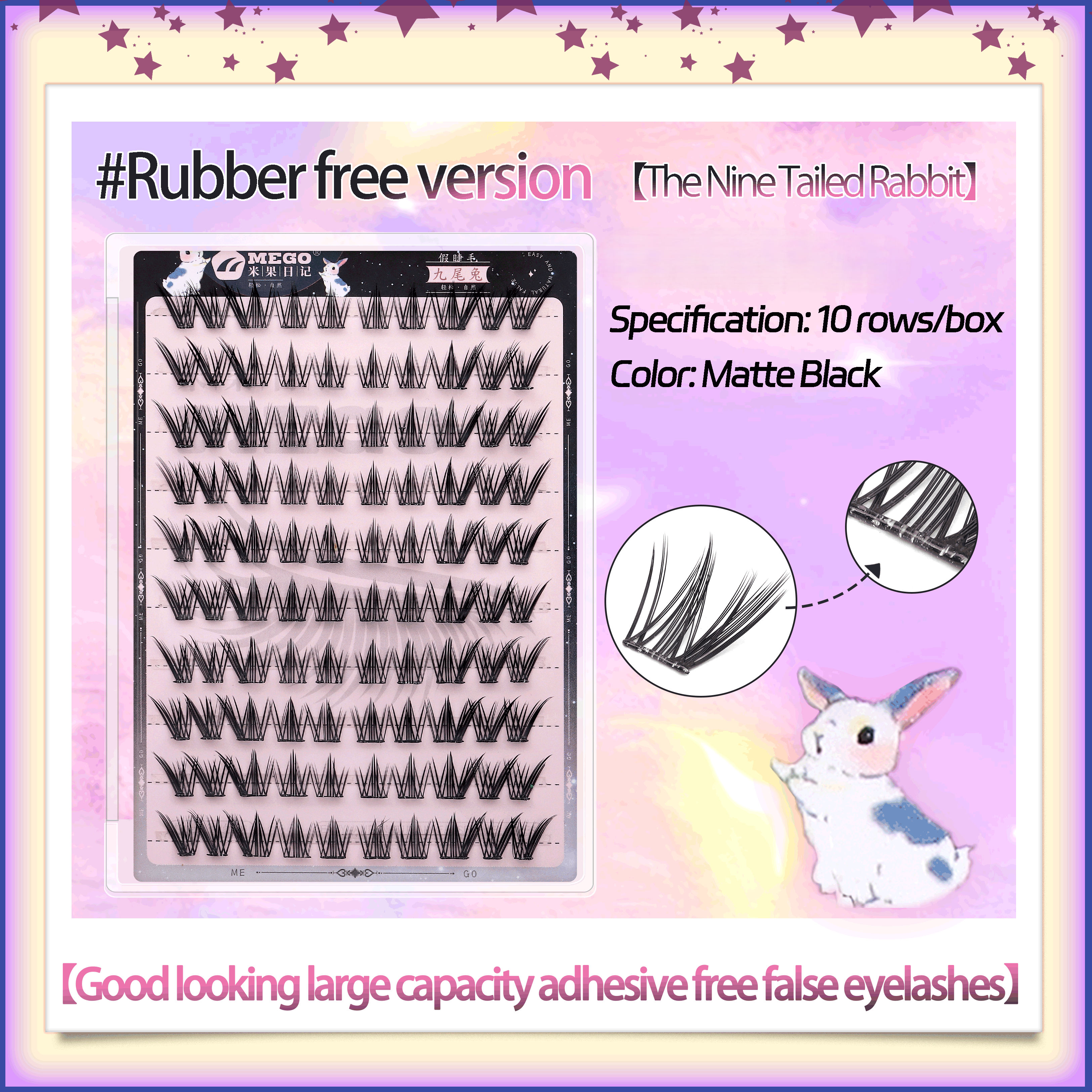 Nine-Tailed Rabbit Glue-Free Cílios Postiços, 10a Fileira, Visual Natural, Autoadesivo para Preguiçosos