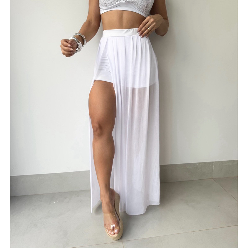 conjunto feminino branco short com saia longa de tule e Cropped de paetê estilo festas festivais aniversários réveillon