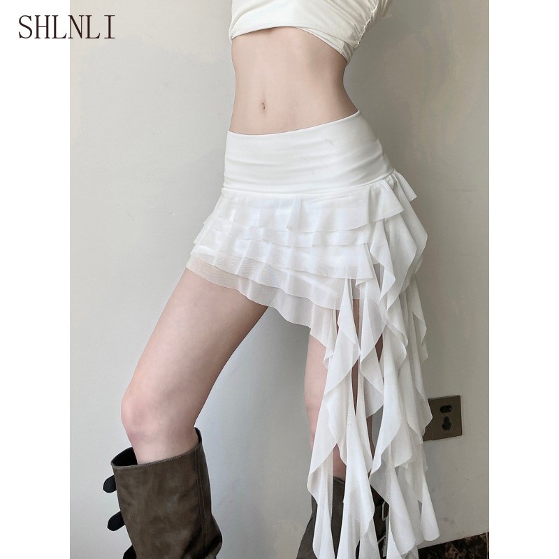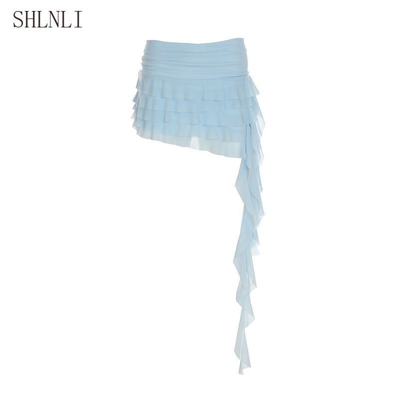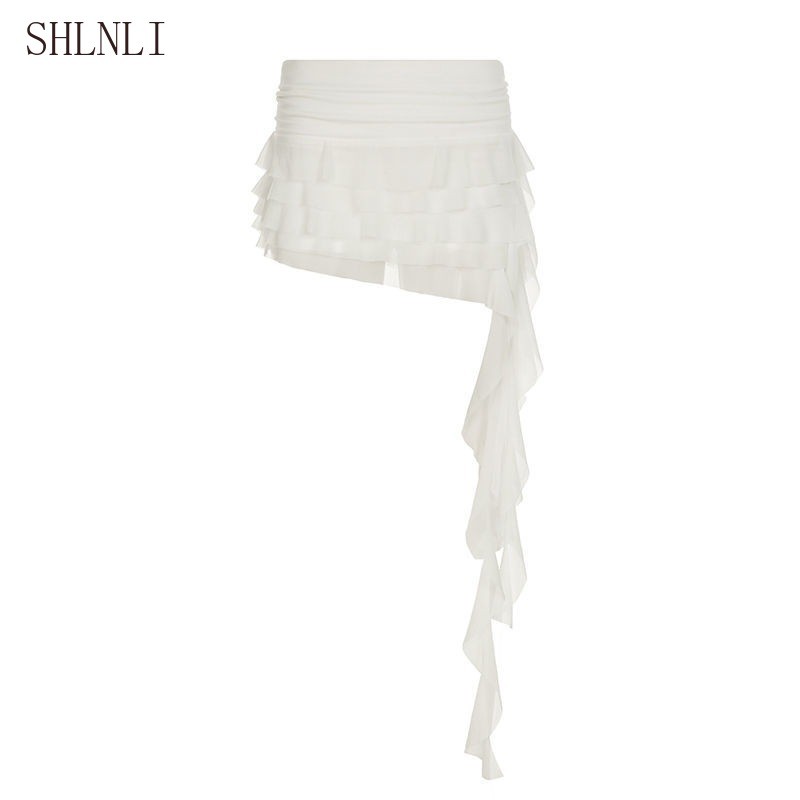 Verão Boêmio Férias Estilo Fino Ajuste Fita Bolo Saia Para Mulheres Cor Sólida Cintura Baixa Irregular Chique Vestido Cu