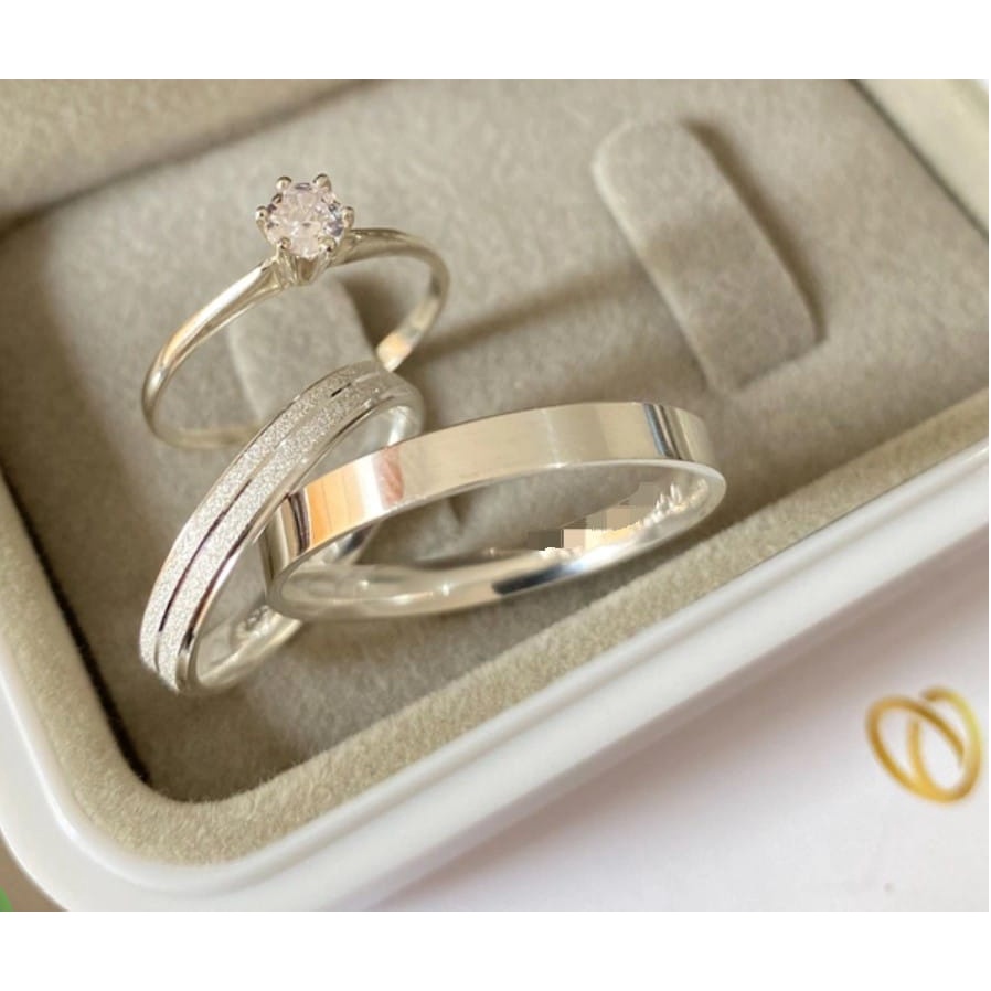 Par De Aliança banhado prata 925 Namoro compromisso Lisa quadrada e diamantada chanfrada 4mm + Anel solitário