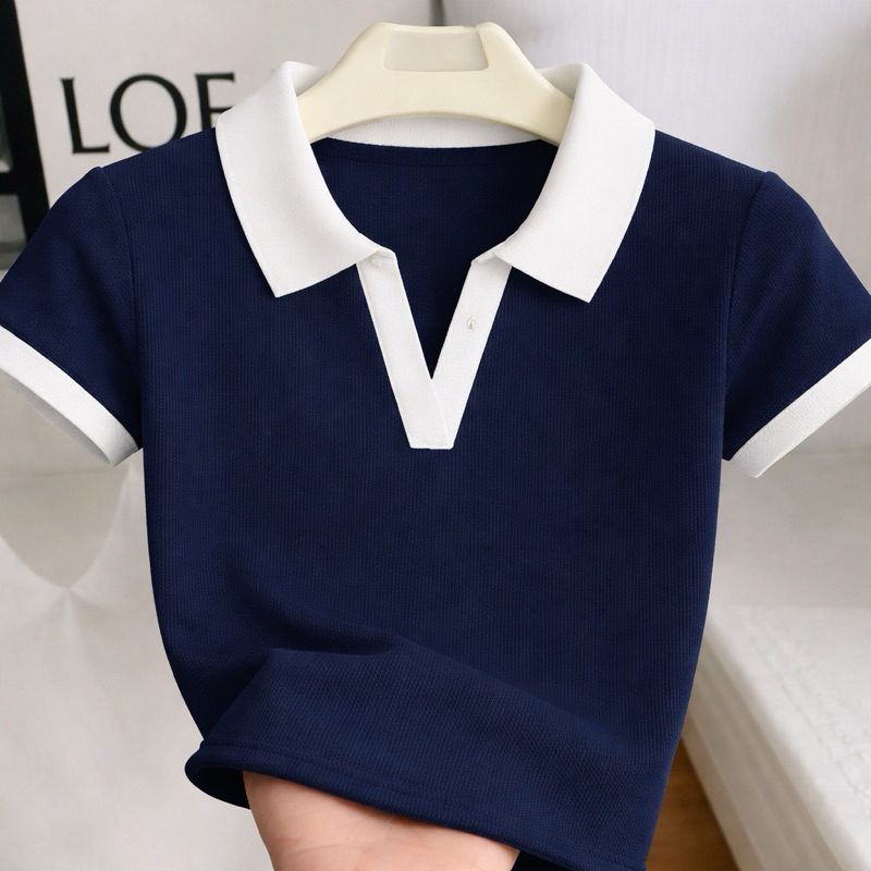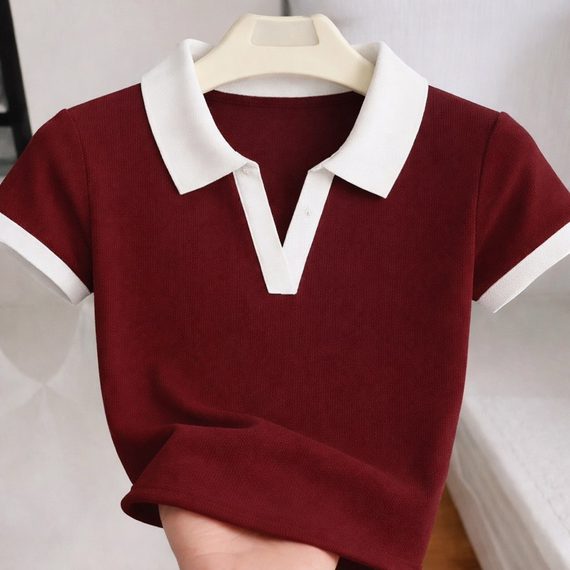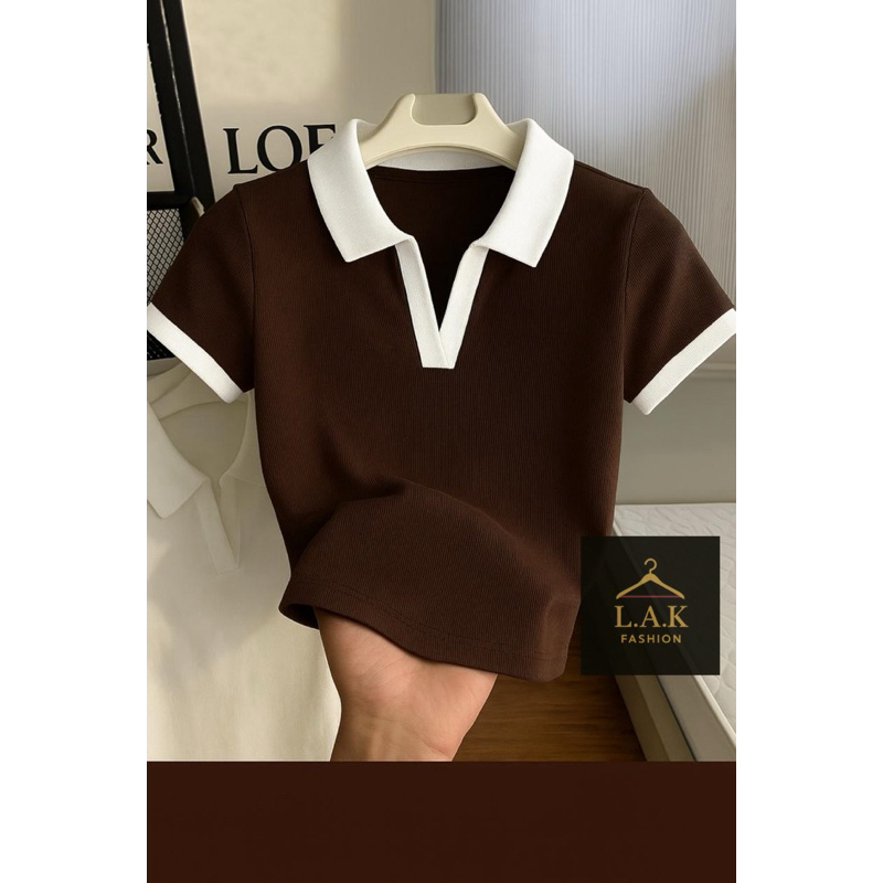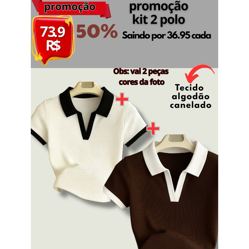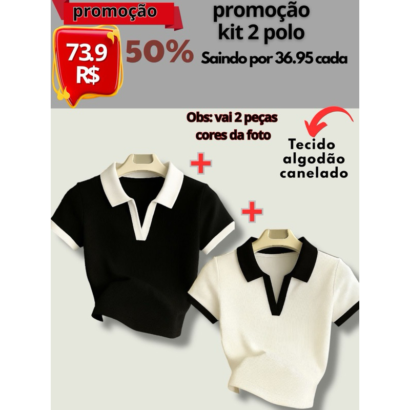 Camiseta Feminina Canelada Gola Polo Detalhe Bicolor Básica Manga Curta Ribana Algodão Malhado