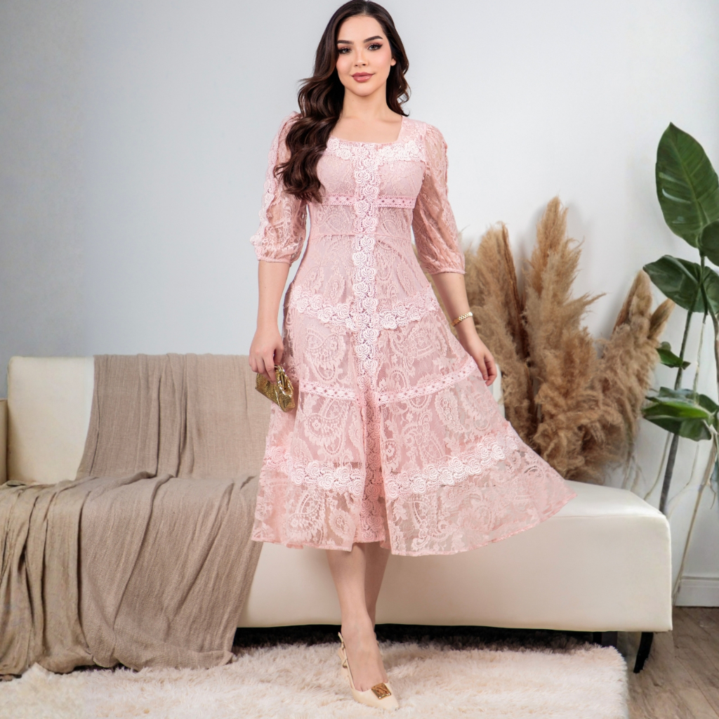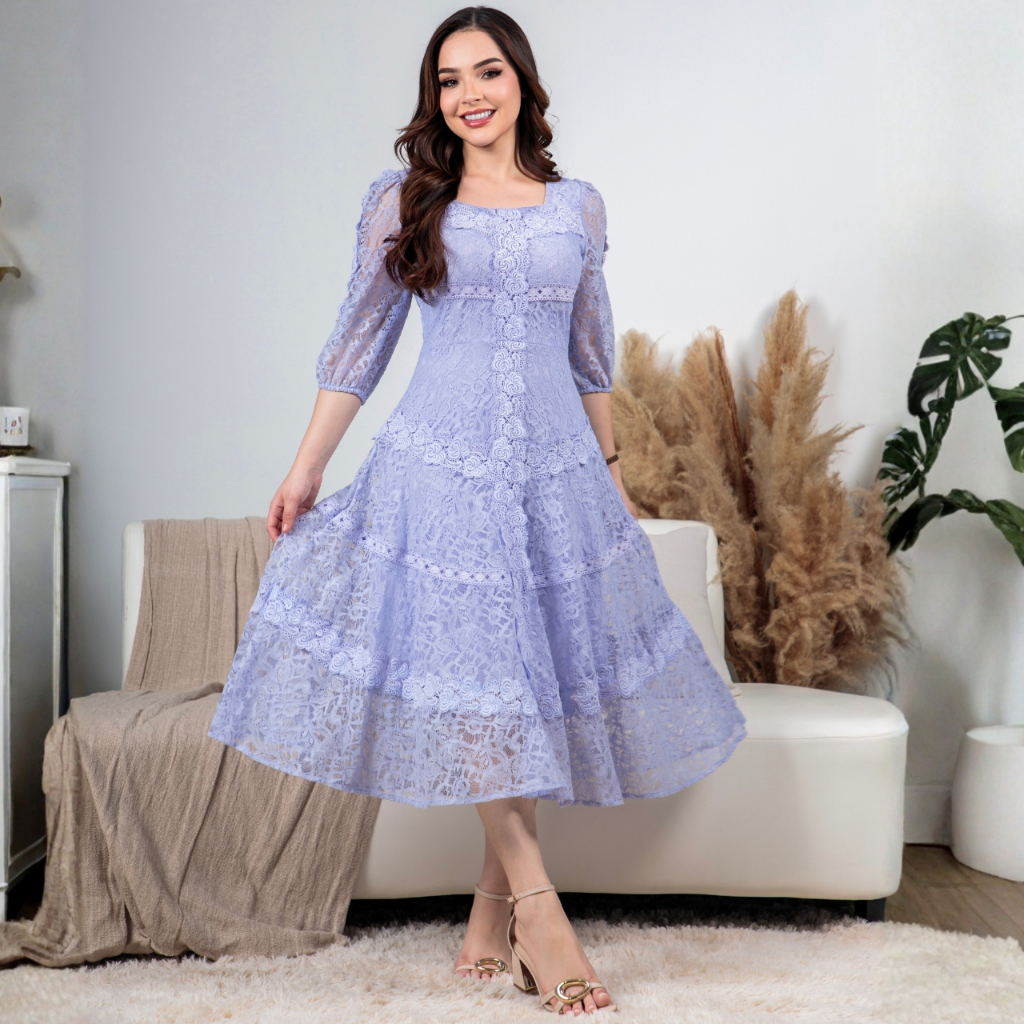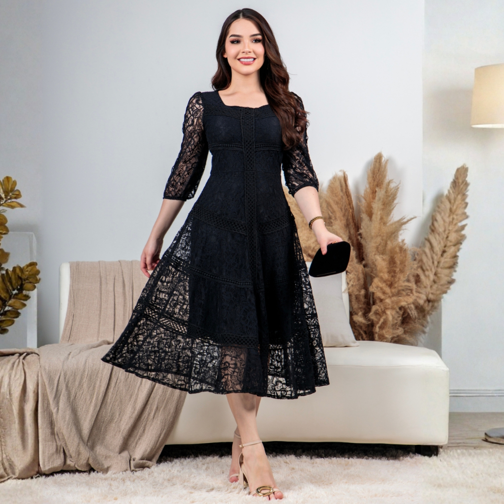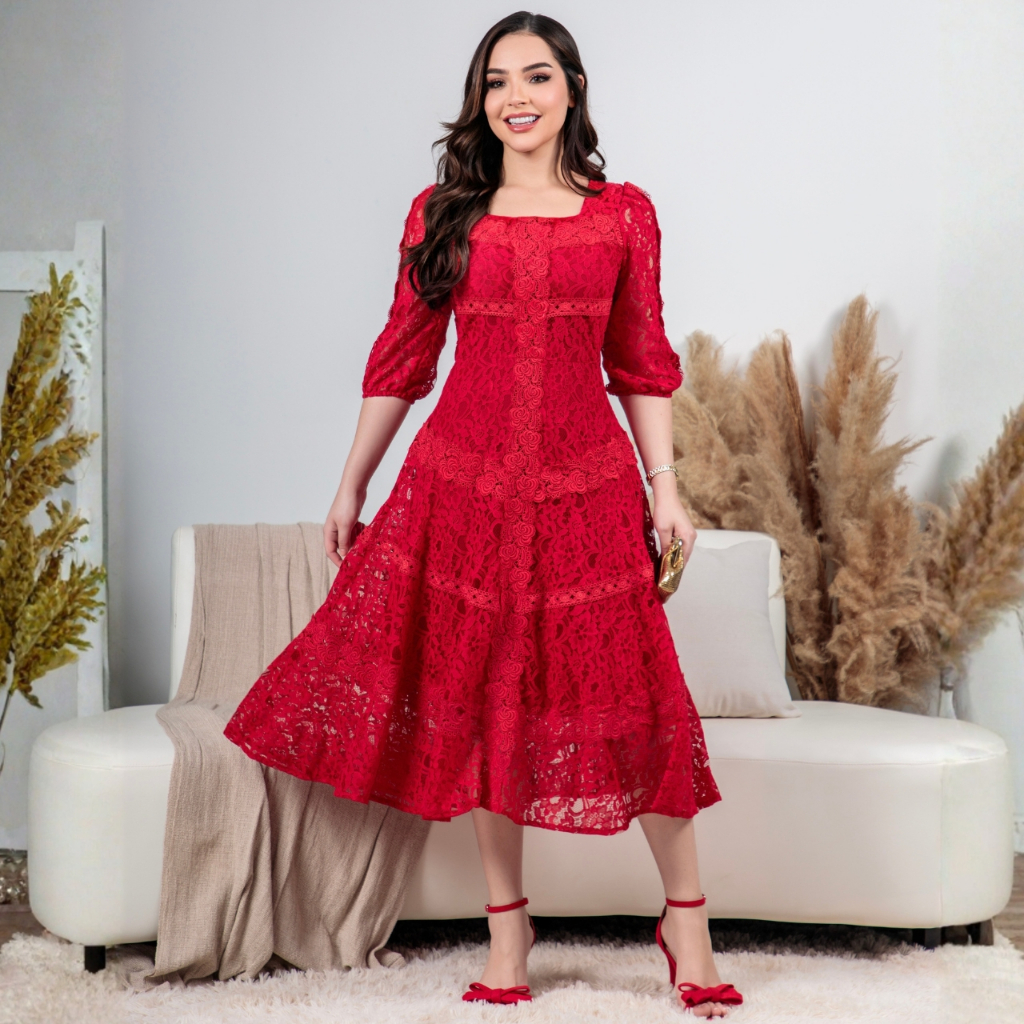Vestido Midi Renda Algodão Elegante Luxo Forrado com Guipir e Zíper Invisível - Moda Evanélica Festas
