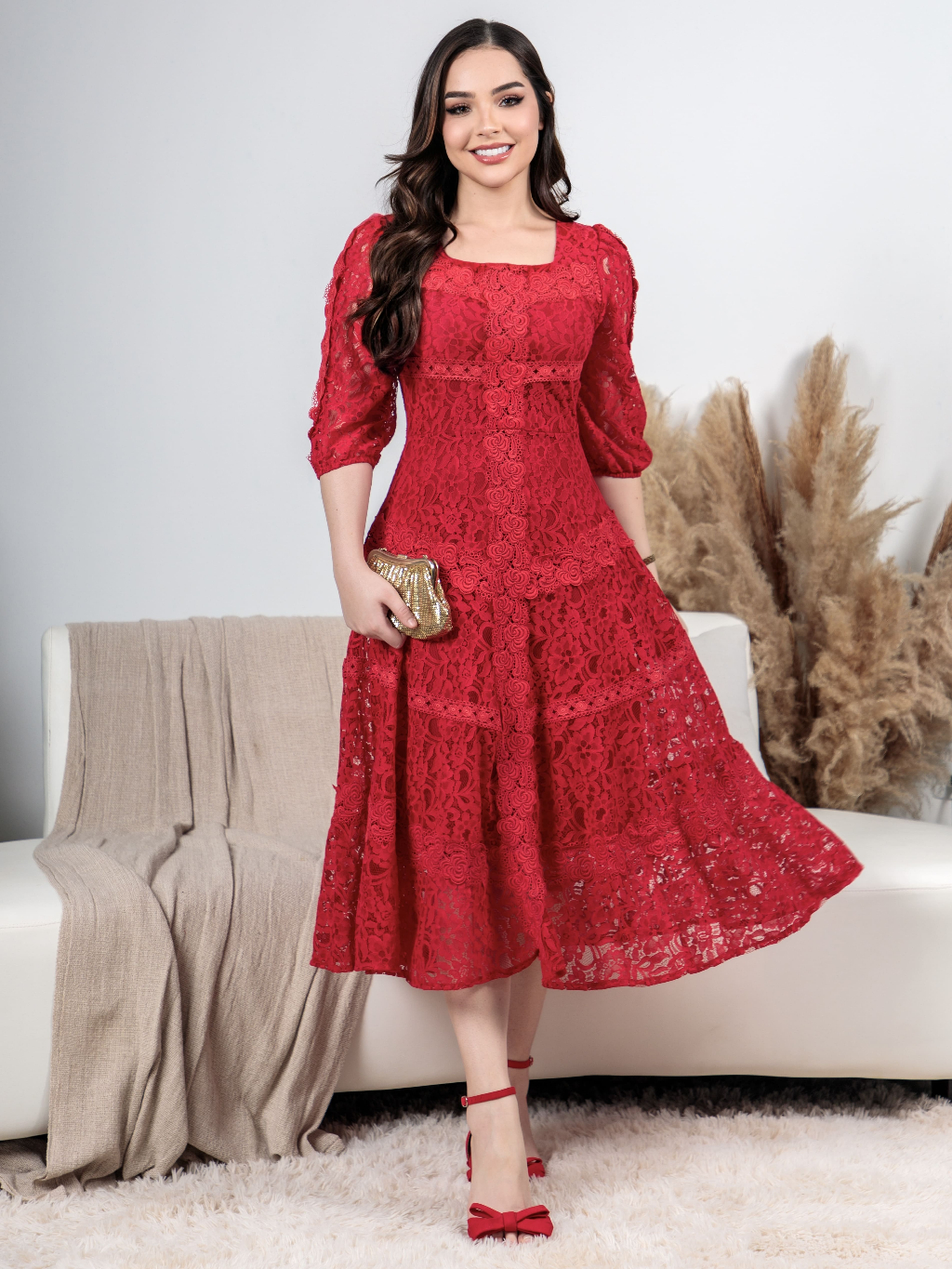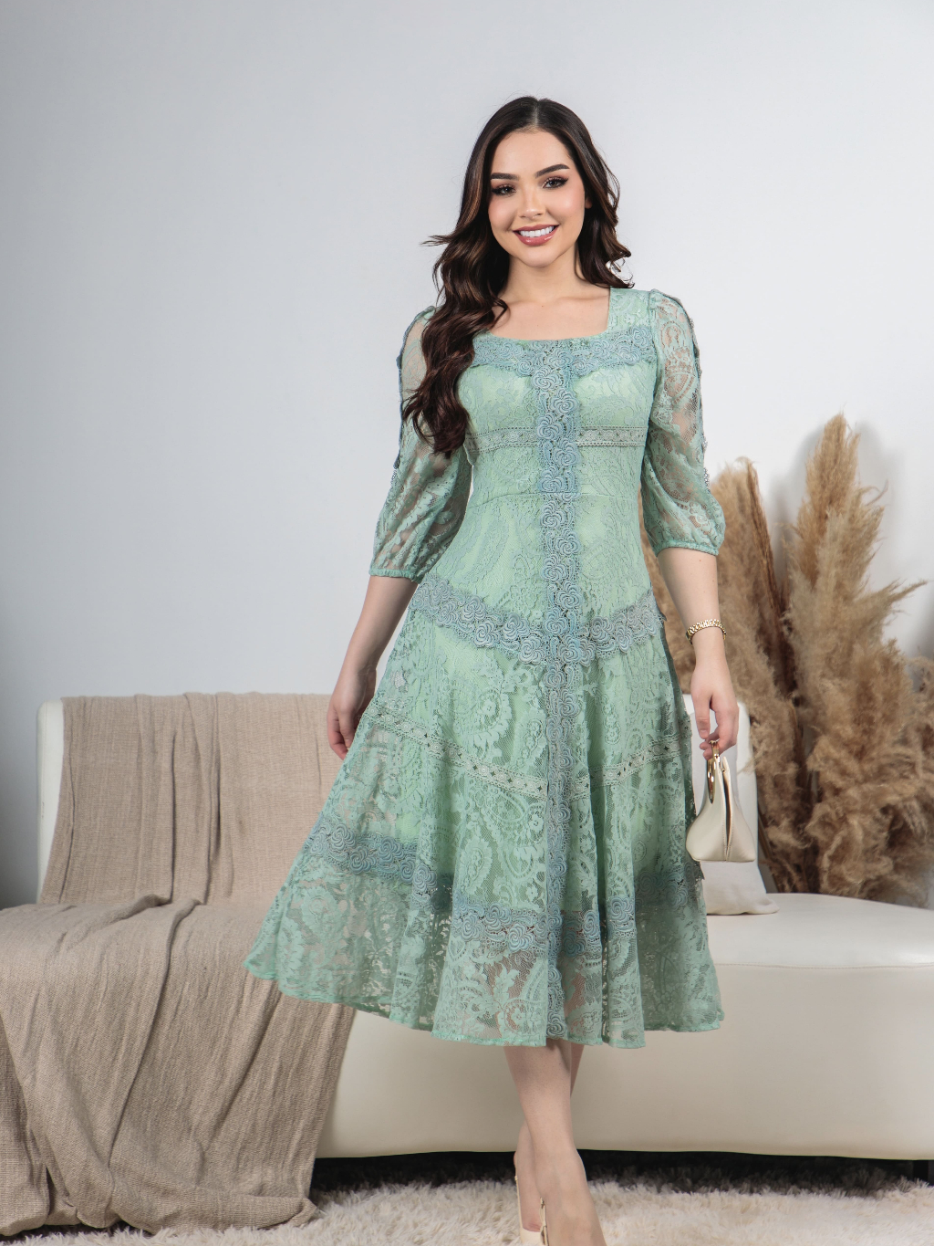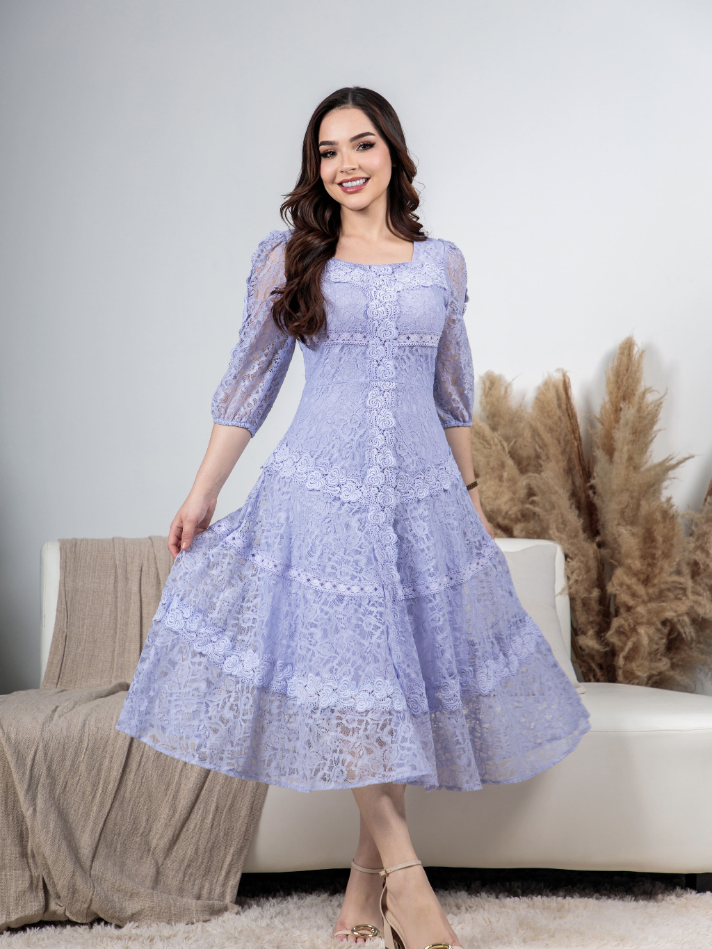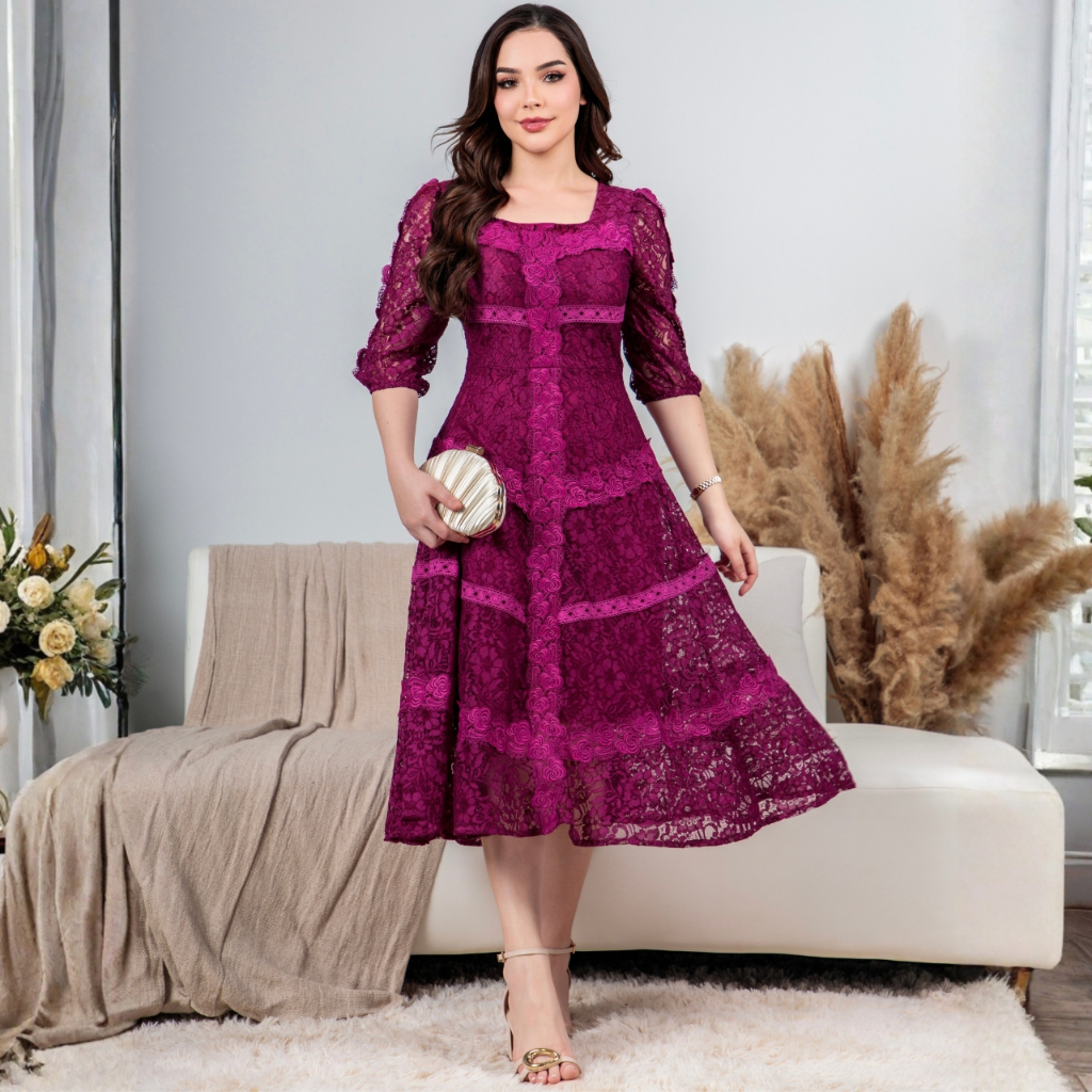 Vestido Midi Renda Algodão Elegante Luxo Forrado com Guipir e Zíper Invisível - Moda Evanélica Festas