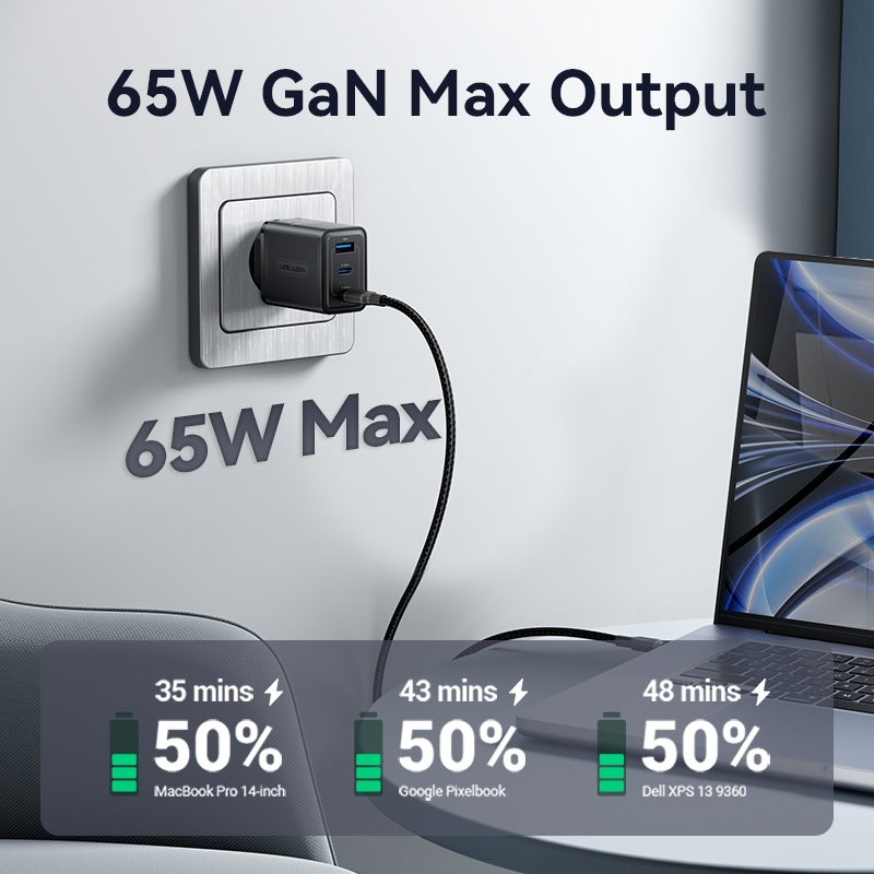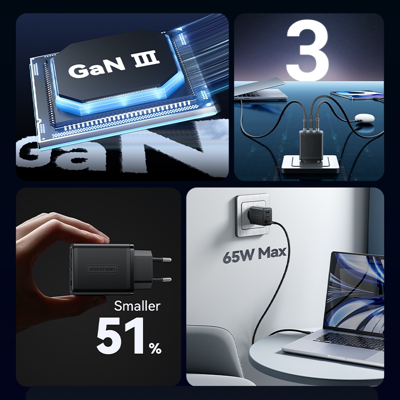 Vention 65W GaN Cabeça De Carregamento Dual Type-C E USB-A PD3.0 PPS 65W Carregador Rápido Máximo Smartphones Laptops