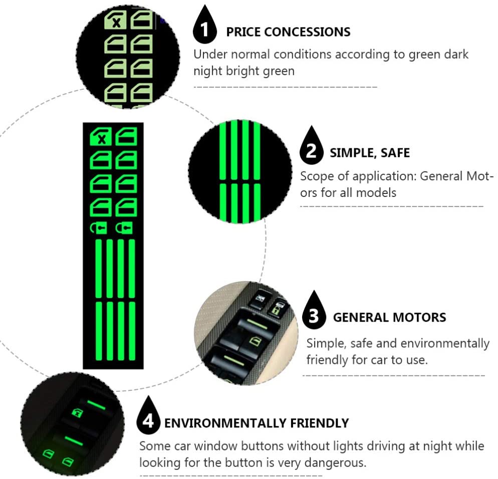 Adesivo luminoso de interruptor de janela de carro / Decalques de segurança fluorescentes noturnos