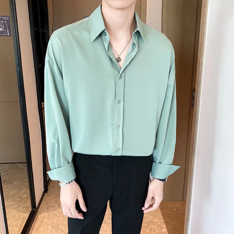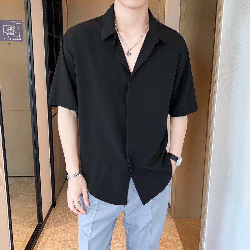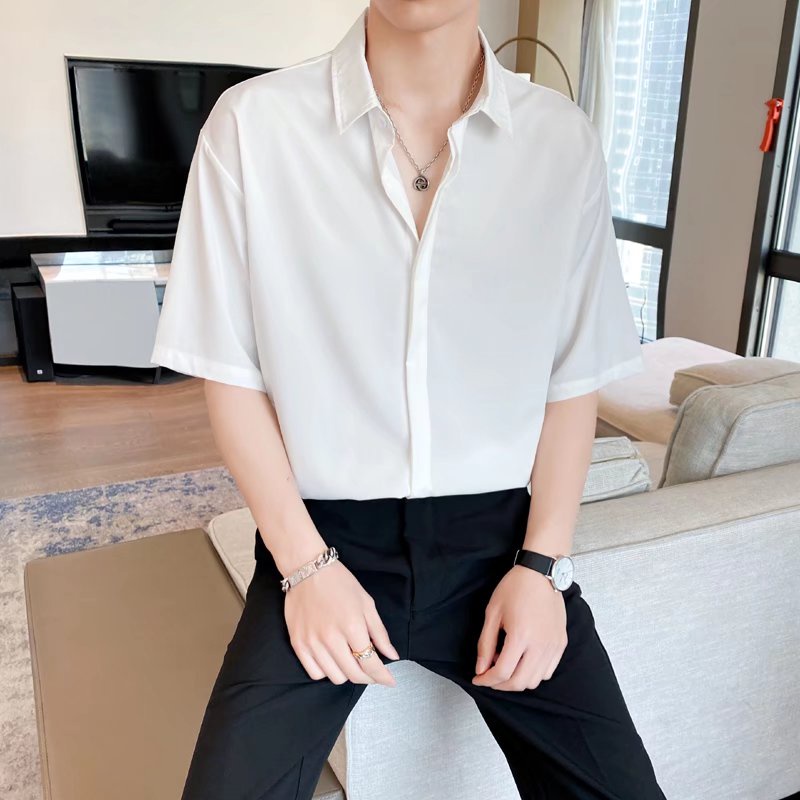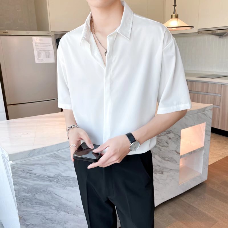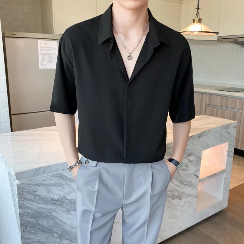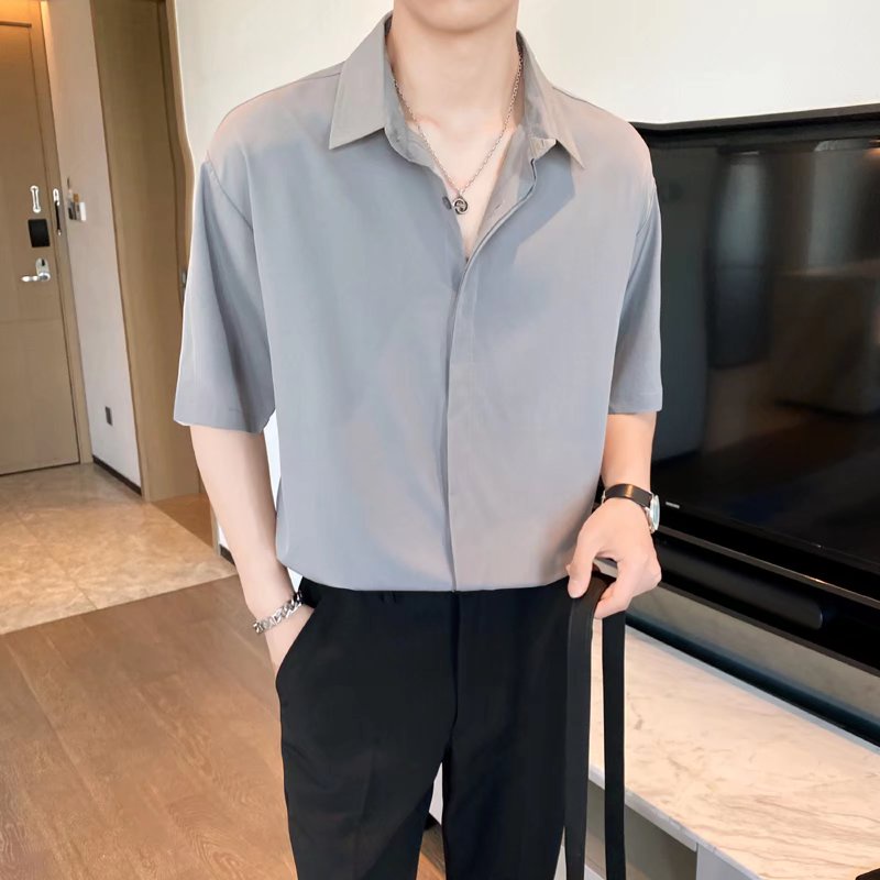 5 Cores [M-XXL] Camisa De Manga Curta De Seda Gelada Coreana Cor Lisa Lapela Solta Estudante Da Moda Masculina Pescoço V