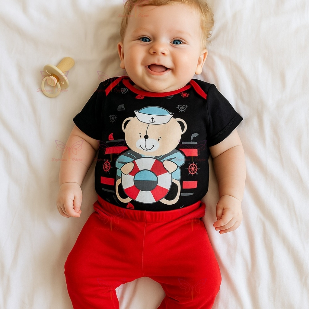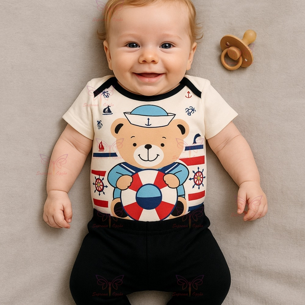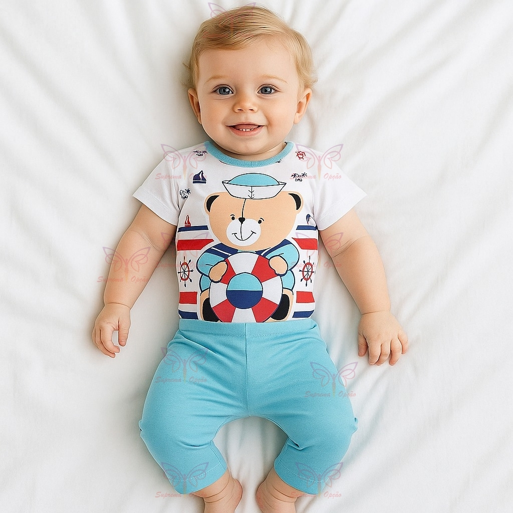 Conjunto Body Manga Curta + Calça Bebê Menino Estampa Urso Veste 02 a 05 Meses