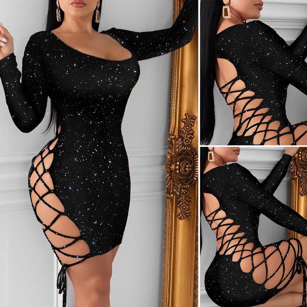 Women Summer Long Sleeve O-neck Low Cut Bodycon Dress