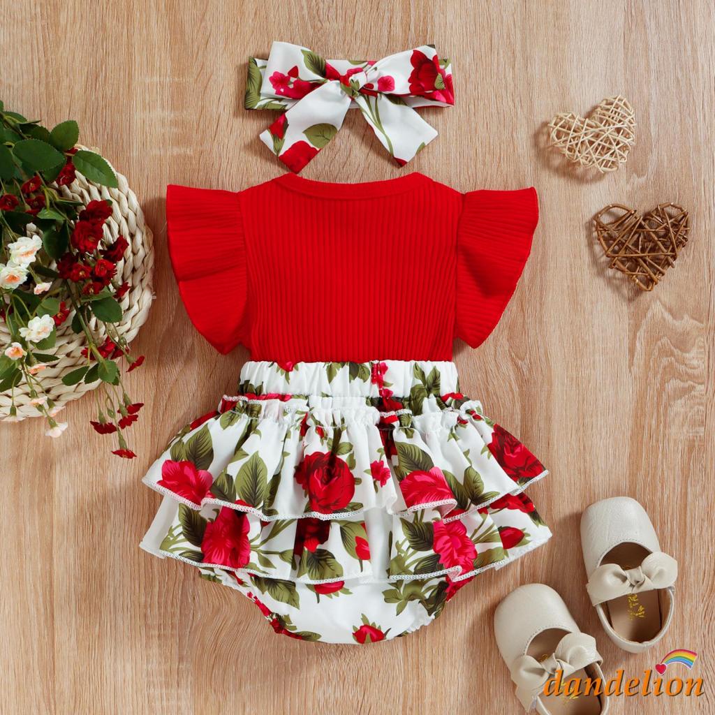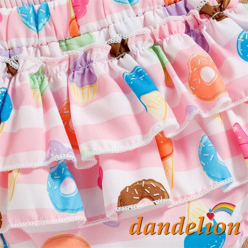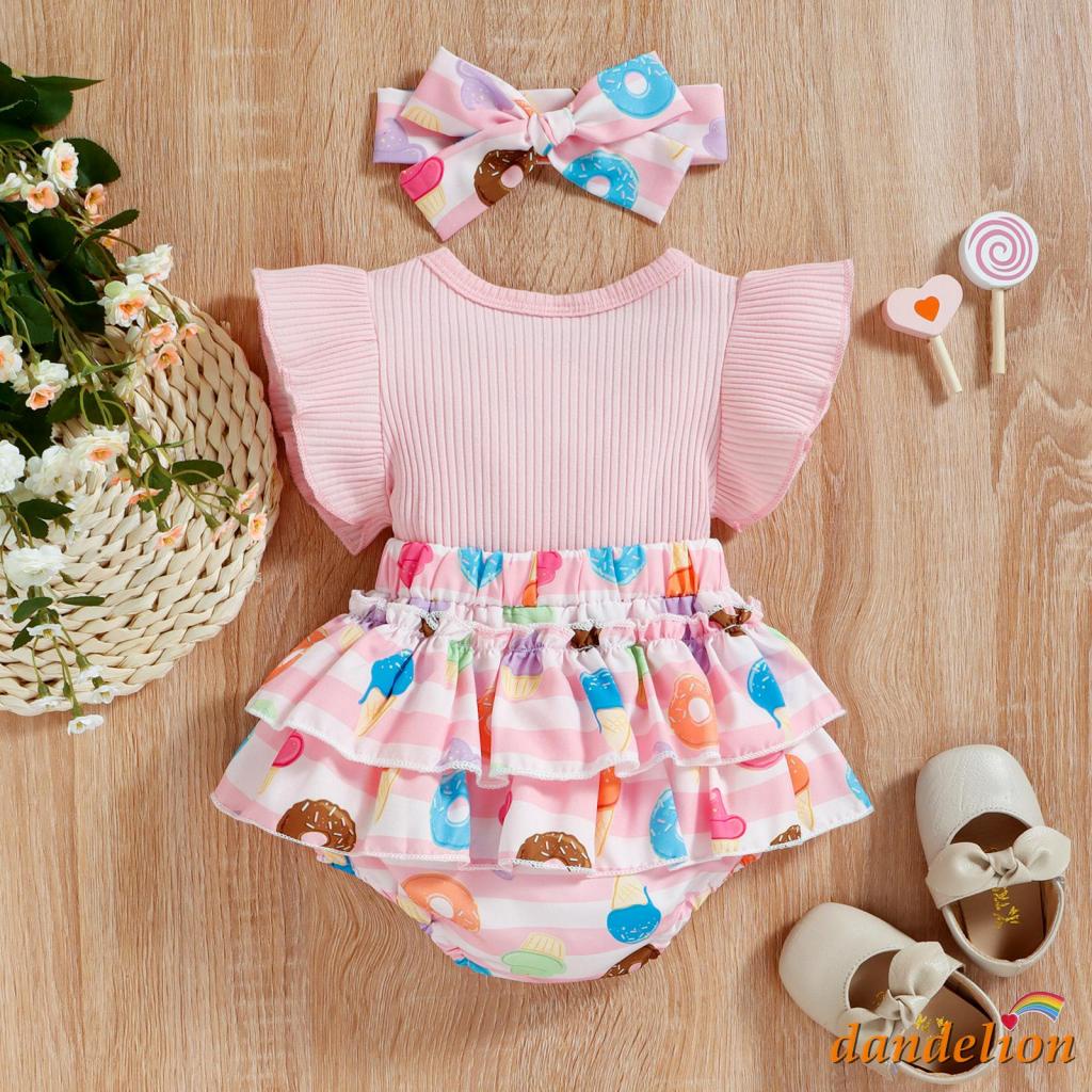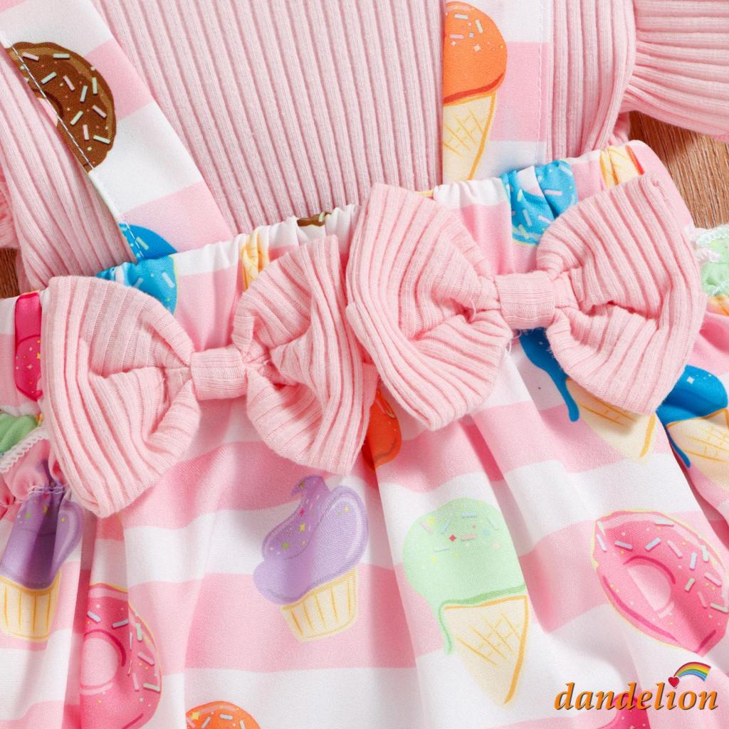 Conjunto para Bebês Meninas 0-18 Meses Macacão com Suspensório, Laço, Estampa de Donut/Flor e Renda Triangular com Faixa de Cabelo.