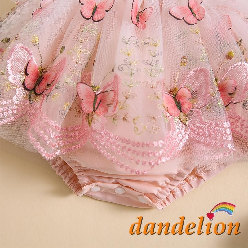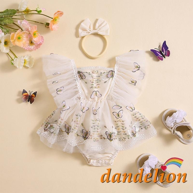 Macacão para bebês meninas com faixa de cabeça, acabamento em renda, padrão de borboleta, manga de mosca bordada, bainha de tule, roupas infantis