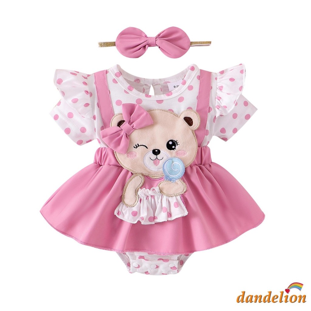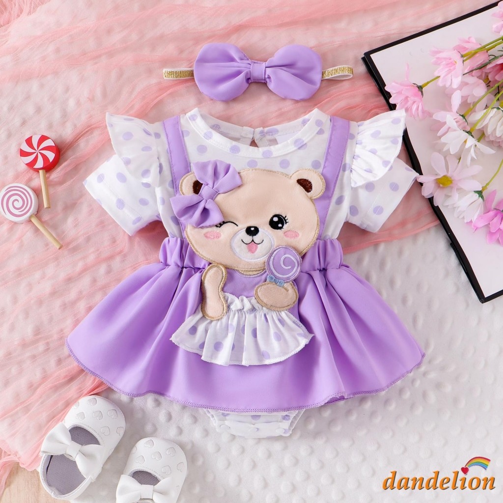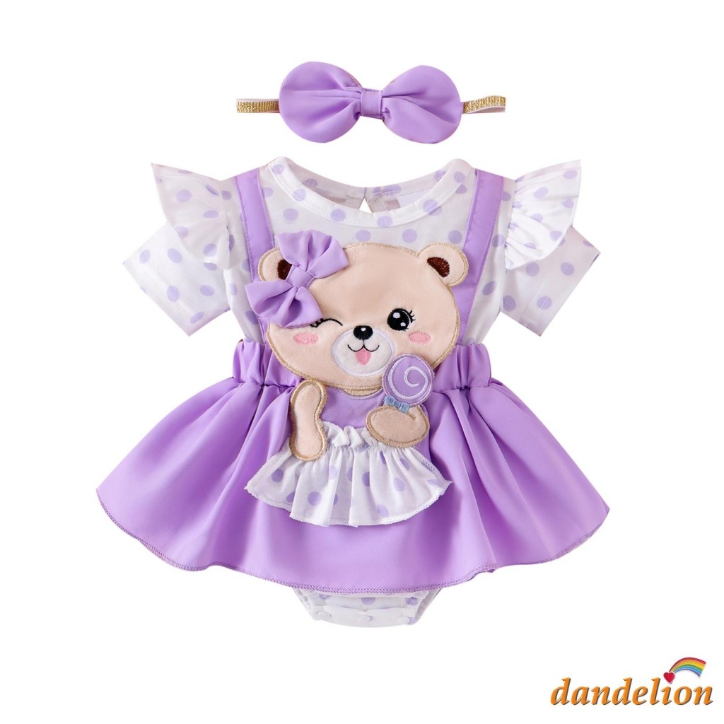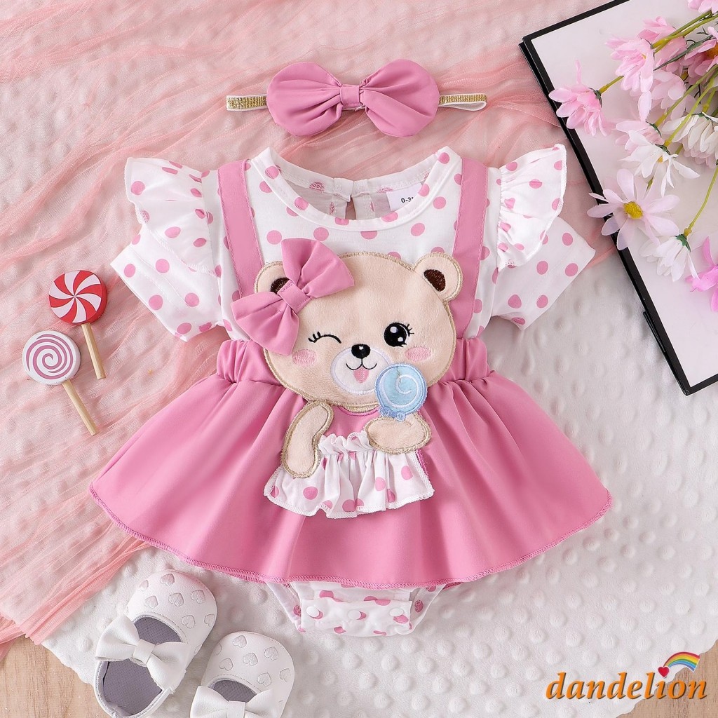 Bebê Meninas Verão Manga Curta Urso Bordado Macacão Com Bandana Roupas Recém-Nascidas