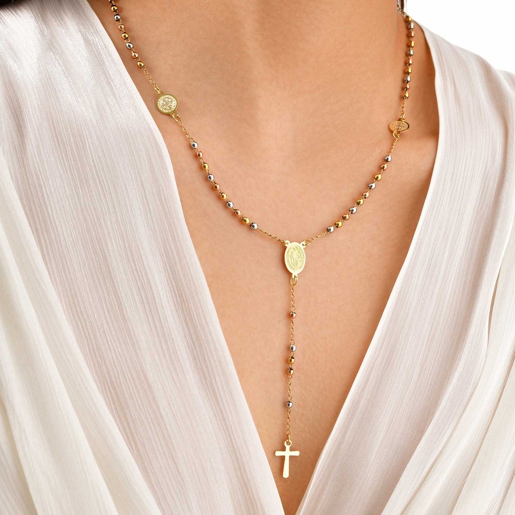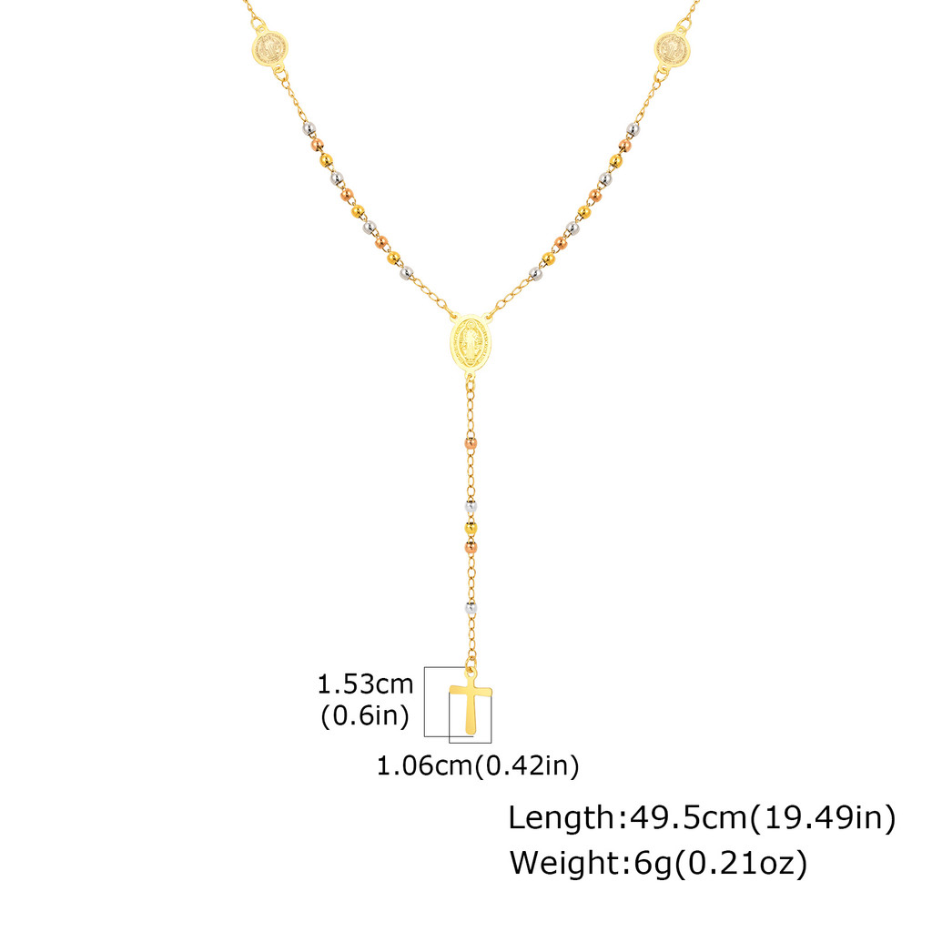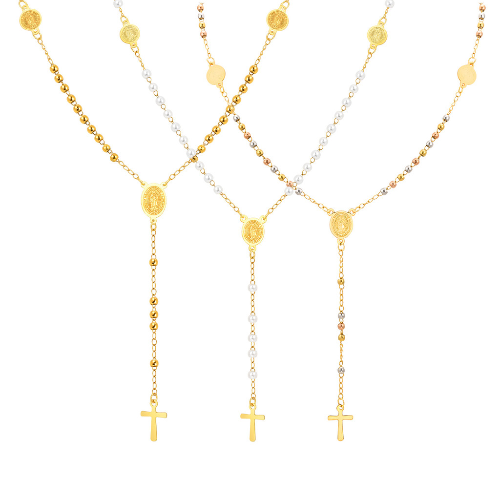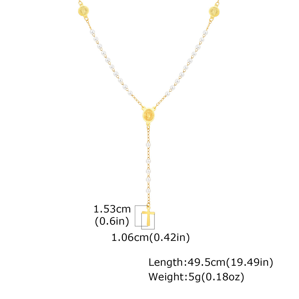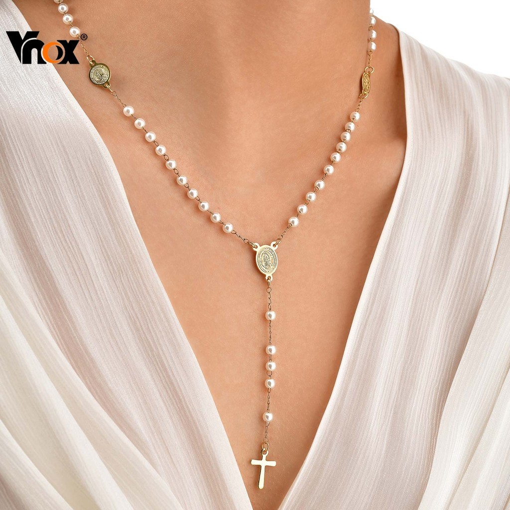 Vnox Pérola Virgem Maria Jesus Cruz Em Forma De Y Colar Para Mulheres , Ouro Aço Inoxidável Longo Delicado Oração Fé Cri