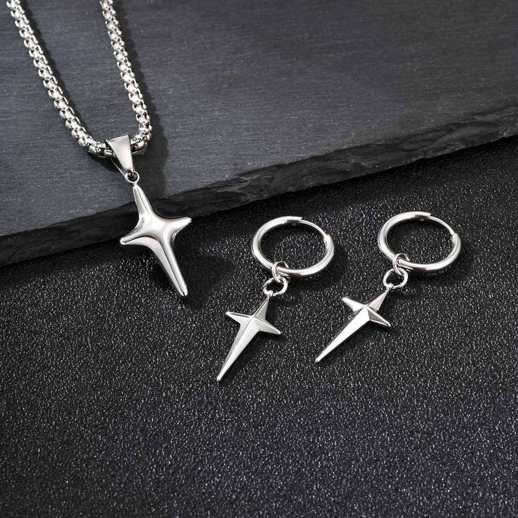 Brinco De Colar Com Pingente De Estrela Vnox Para Mulheres E Homens , Conjunto De Joias De Aço Inoxidável Prateado Prese