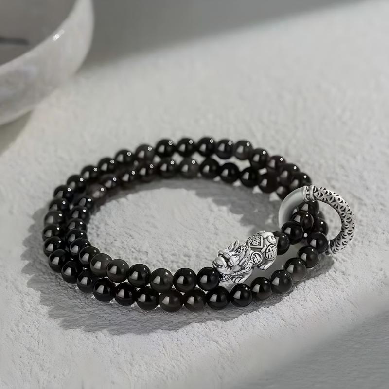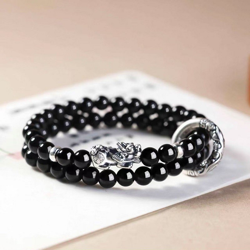 Vnox Fashion Pixiu Pulseira De Corda Elástica Com Contas Pretas De Camada Dupla Para Homens , Joias Da Moda , Presente P