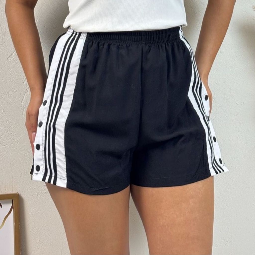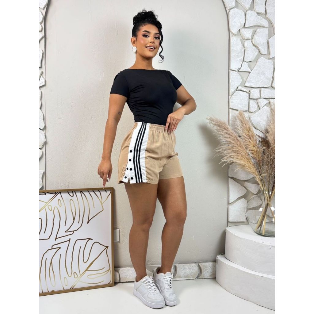 Shortinho Feminino Com Botao Lateral Faixa Listrada Tecido Viscose Cintural Alta Jogger Moda Fitness Treino Academia