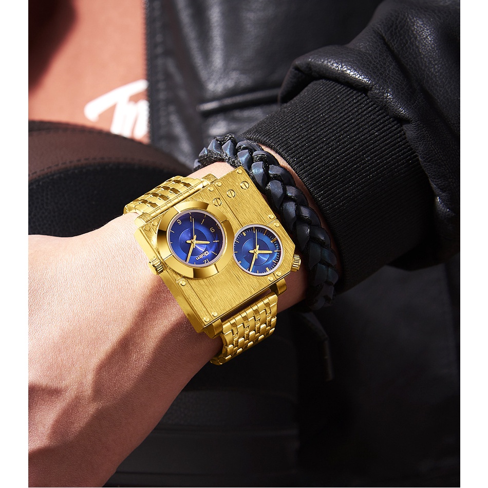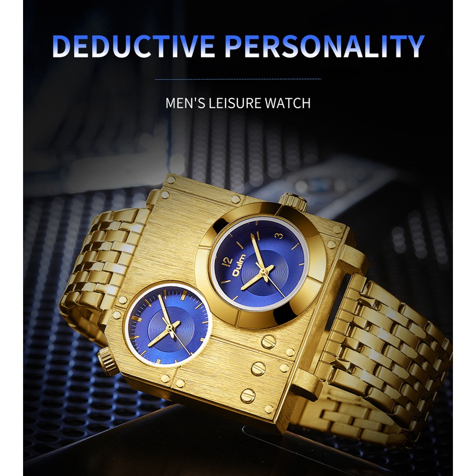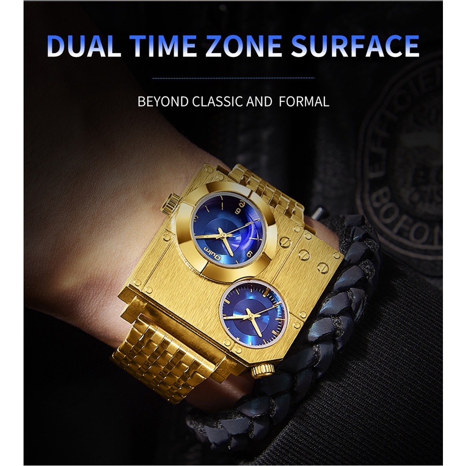 Oulm Casual Grande Quadrado Relógio De Ouro Masculino Relógios De Aço Com Zona De Tempo Duplo