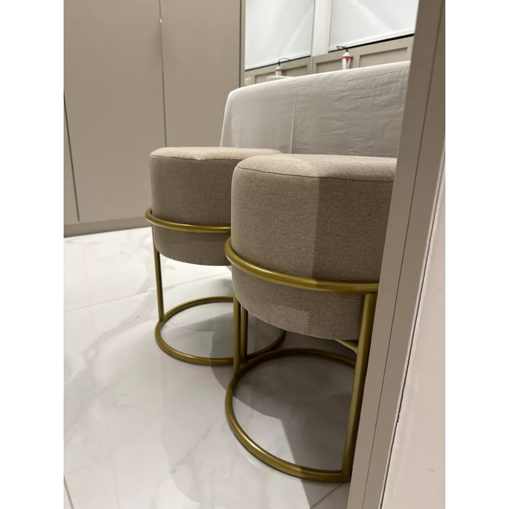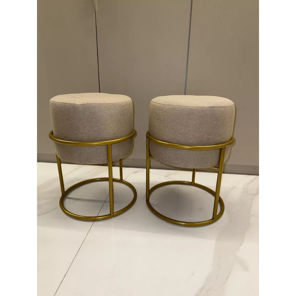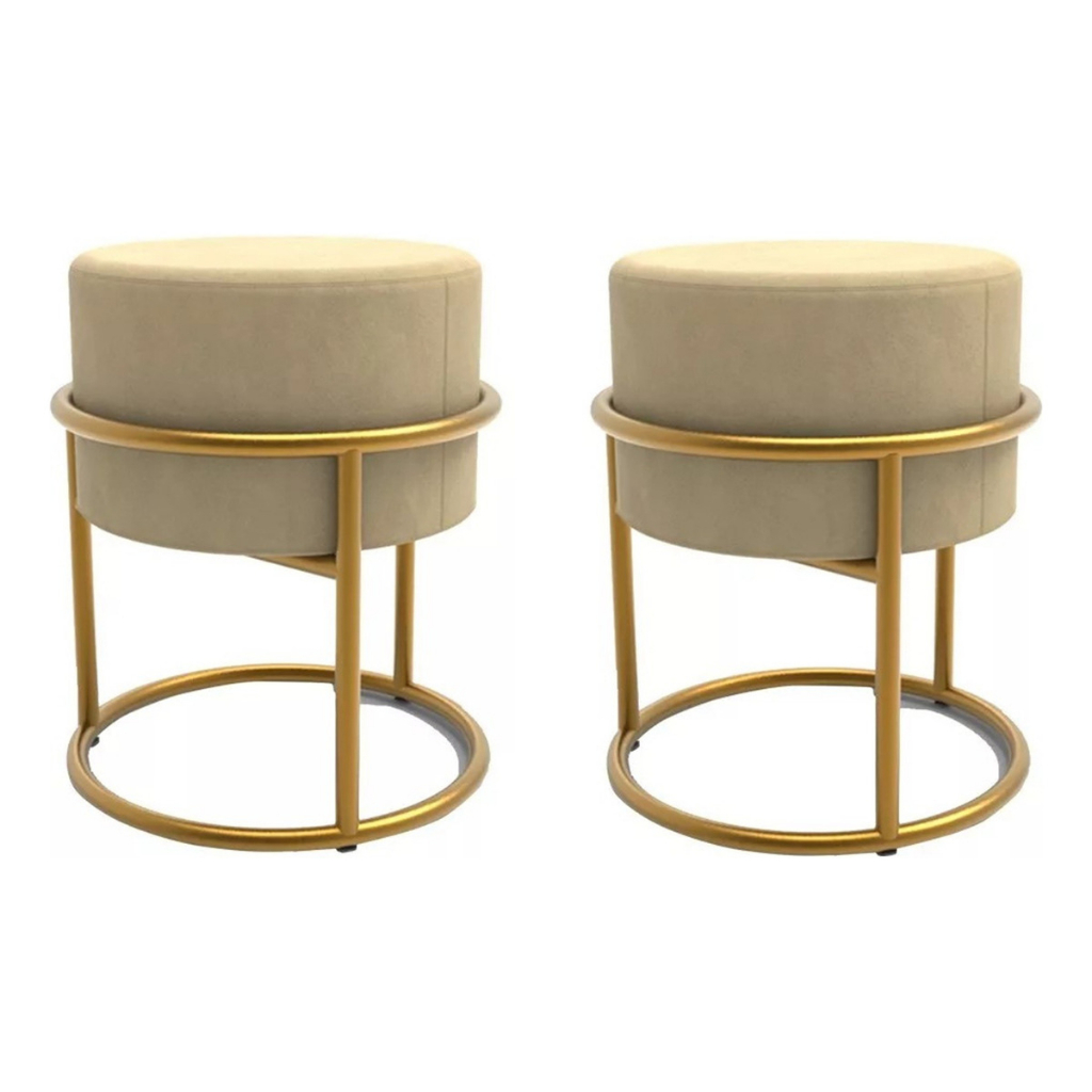 2 Puff Iron Base Ferro Argola Dourada Metalizada Suede Bege