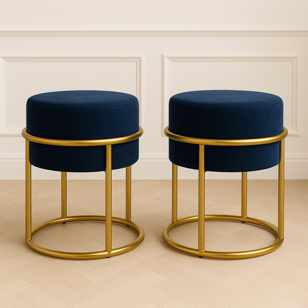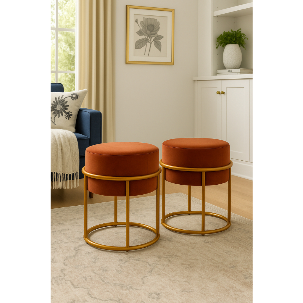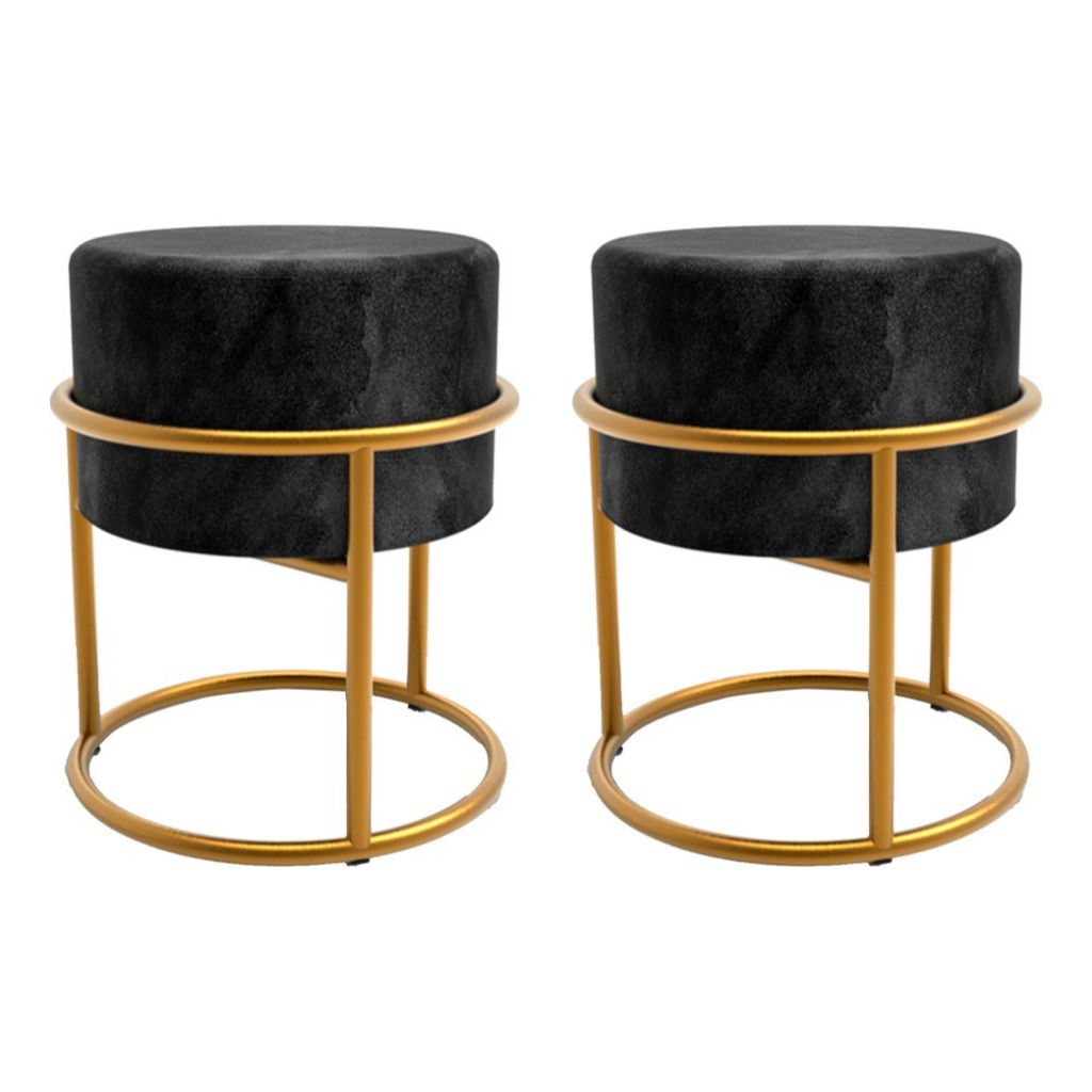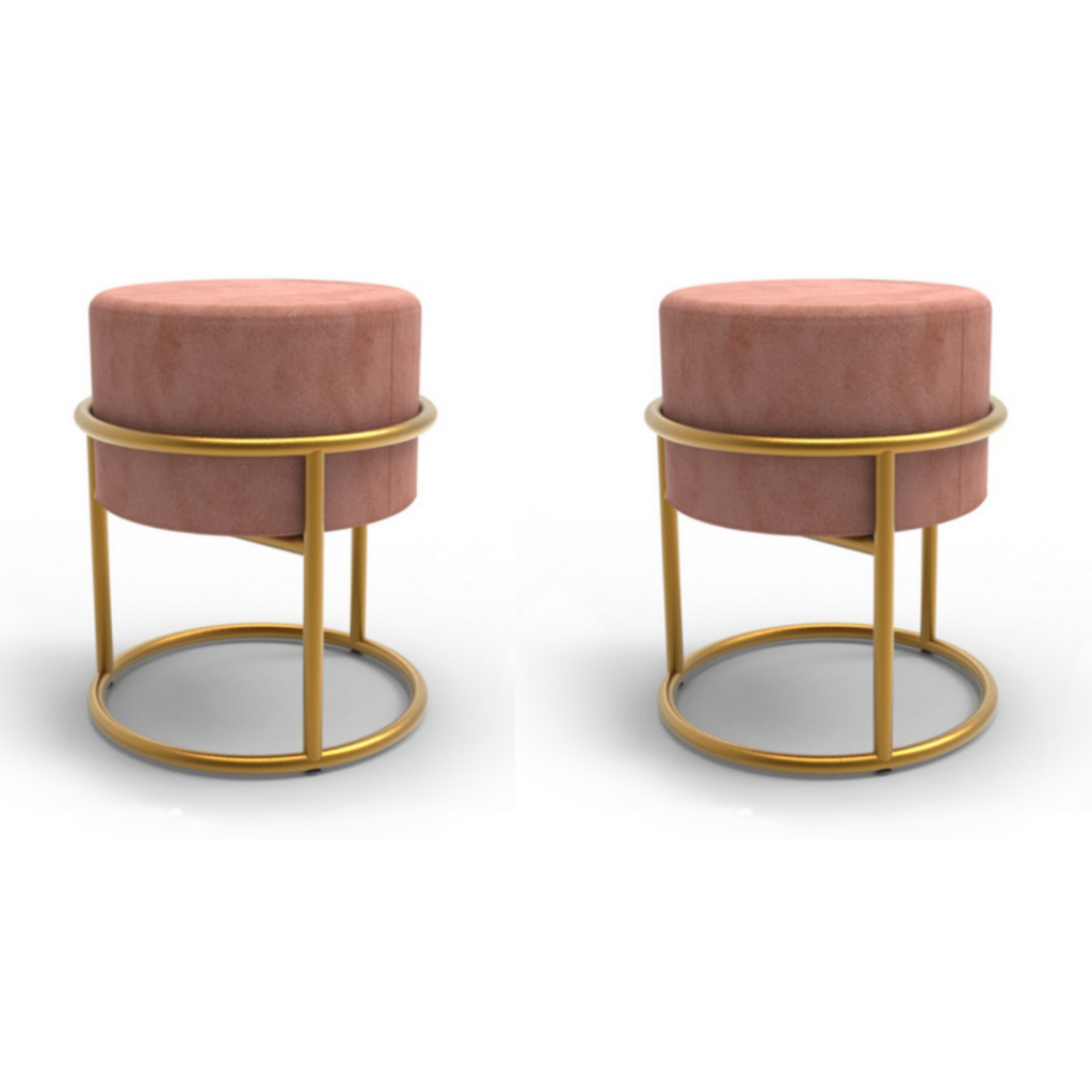 2 Puff Iron Base Ferro Argola Dourada Metalizada Suede Bege