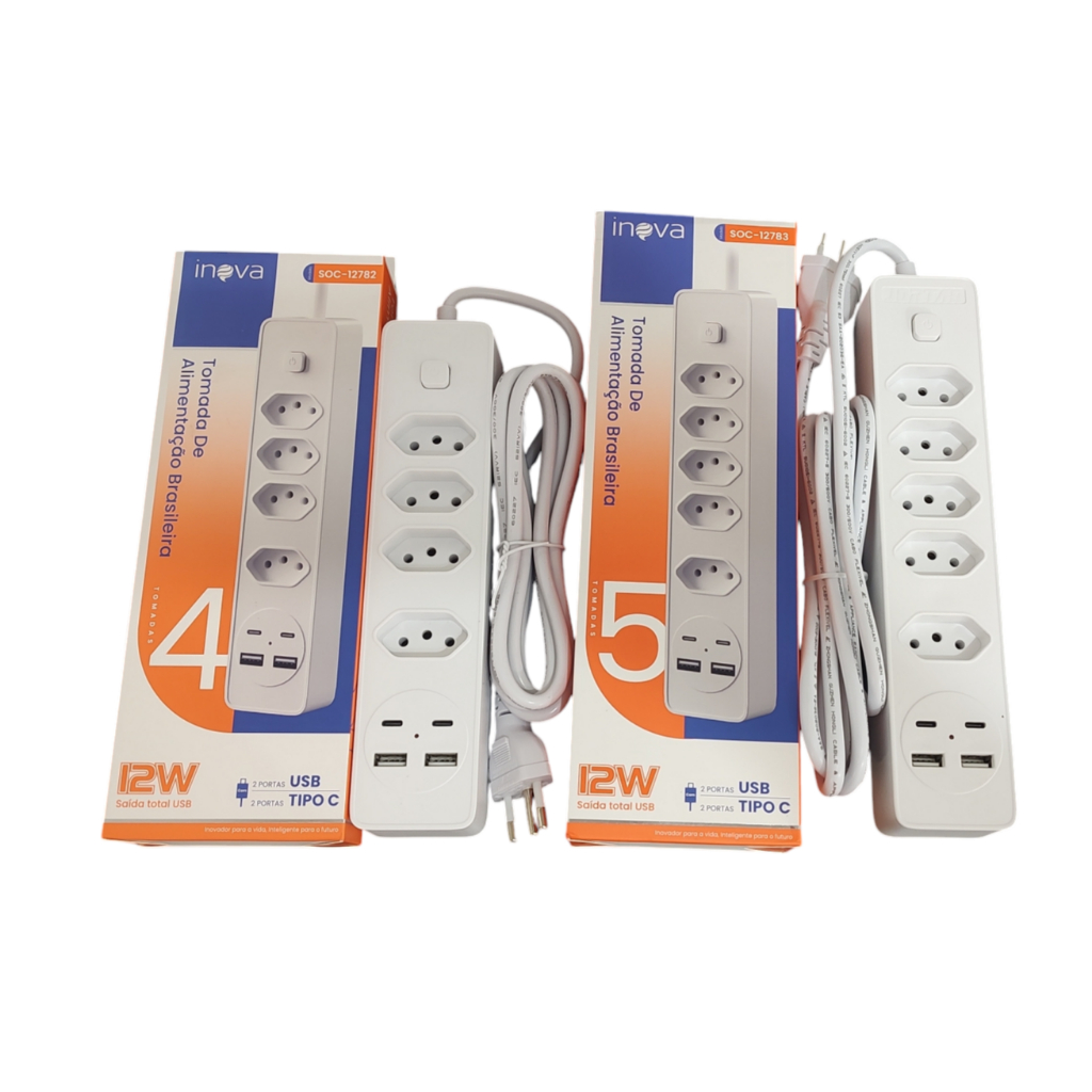 Tomada Extensão 2-3-4 ou 5 tomadas + 2 Tipo C + 2 USB com cabo de 2 Metros