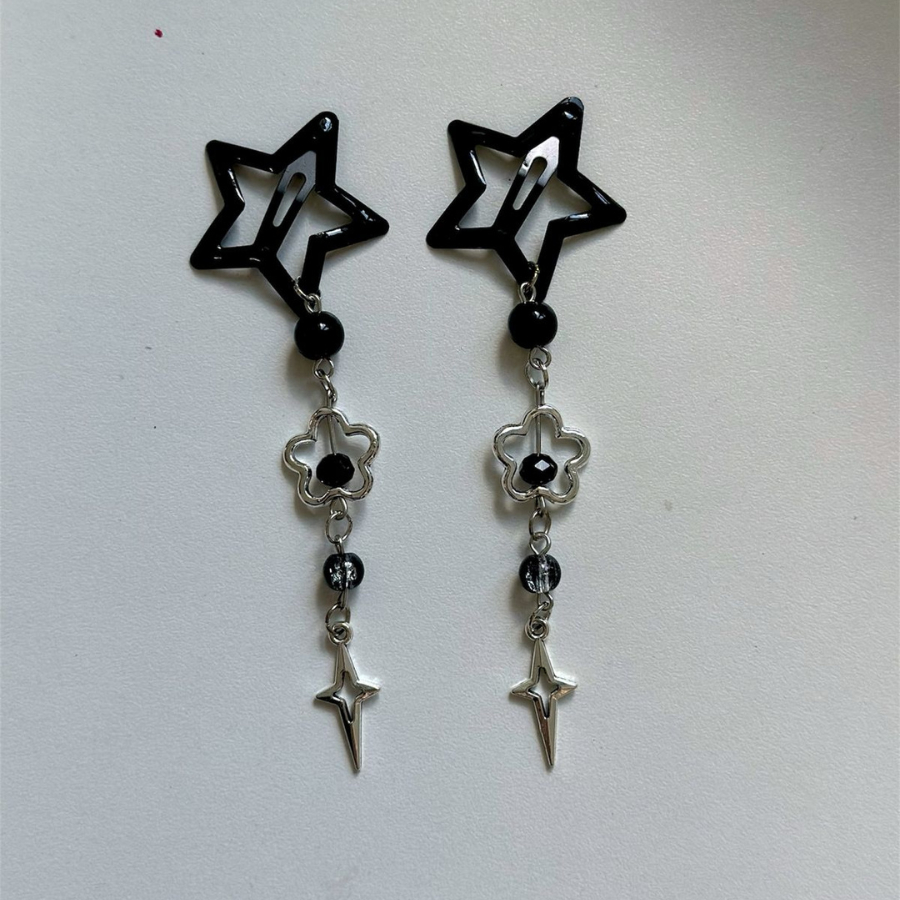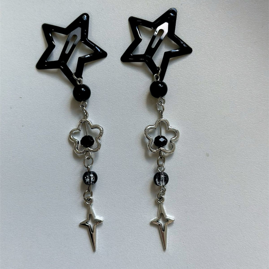 Par de Presilha Preta de Cristal - estrelas pretas com pingente de estrela quatro pontas com cristal