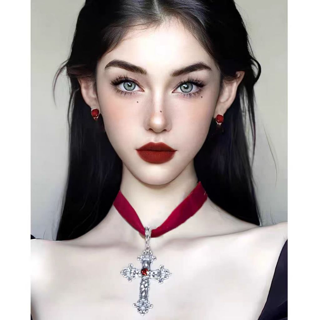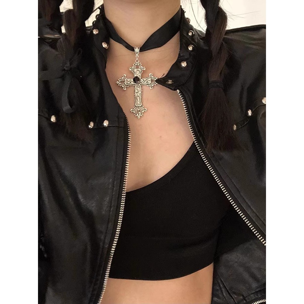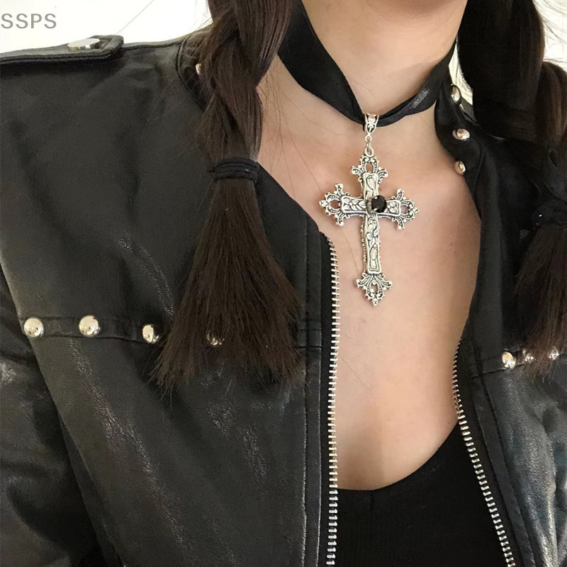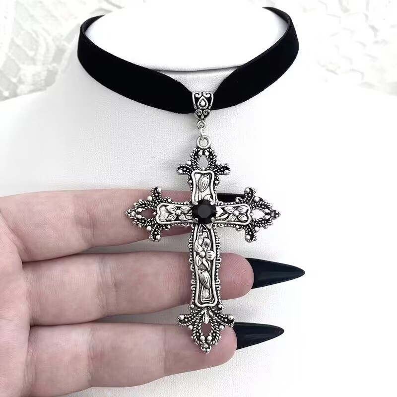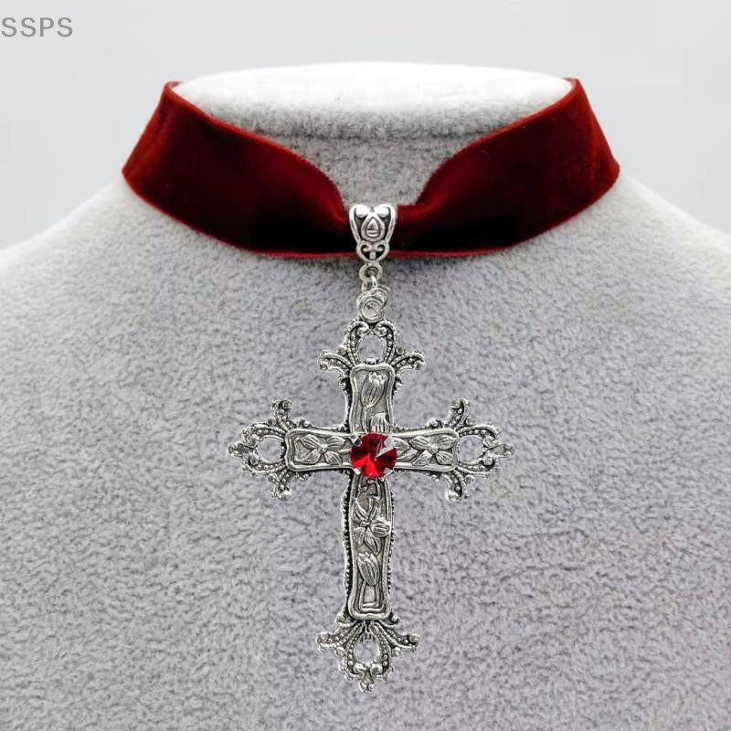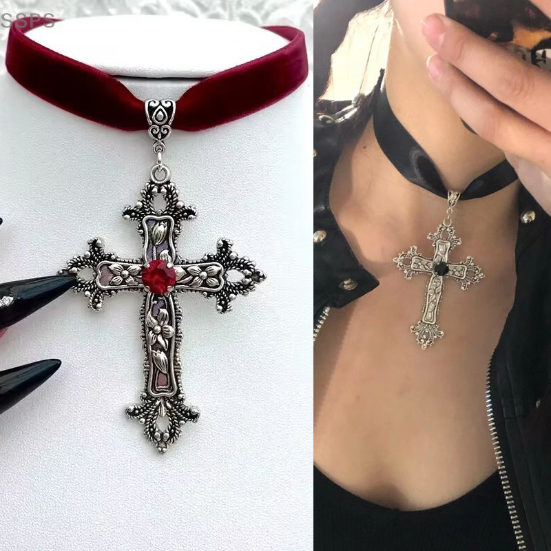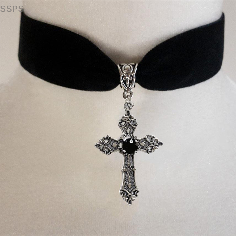 [SSPS] Gargantilha Gótica Vintage Gótico Grande Cruz De Veludo Ornate Cross Preto Grunge Gift For Women Girls FAH
