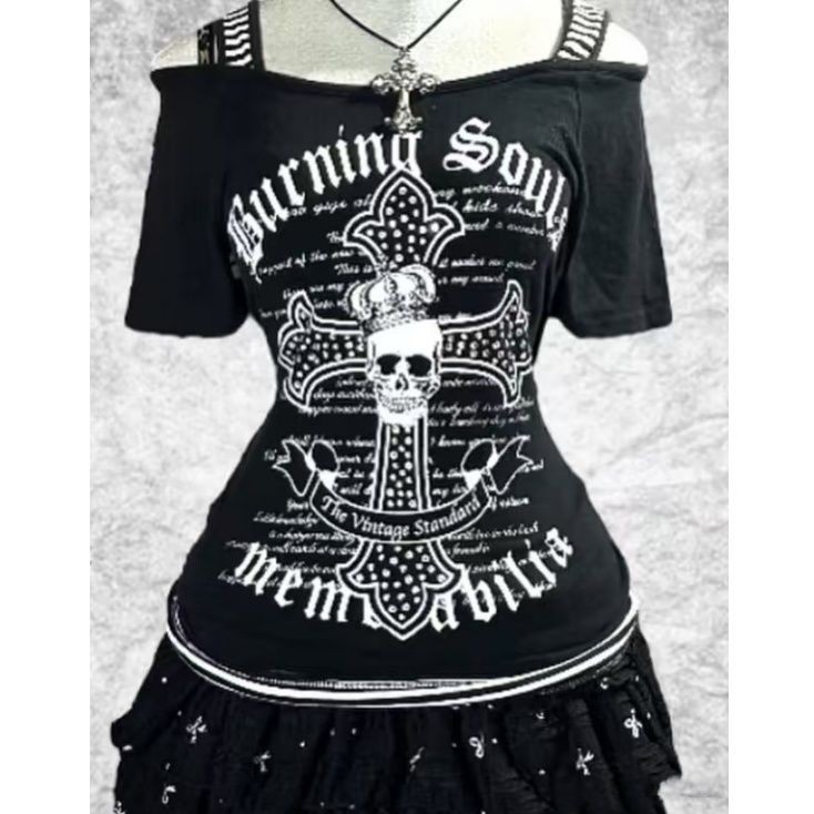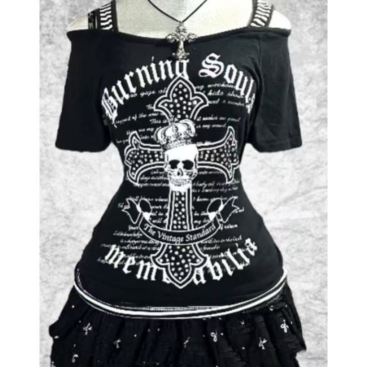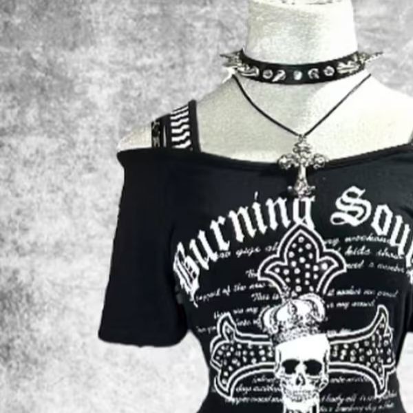 Camiseta Feminina Vintage Com Estampa De Caveira Y2K Fora Do Ombro Manga Curta Top Emagrecedor